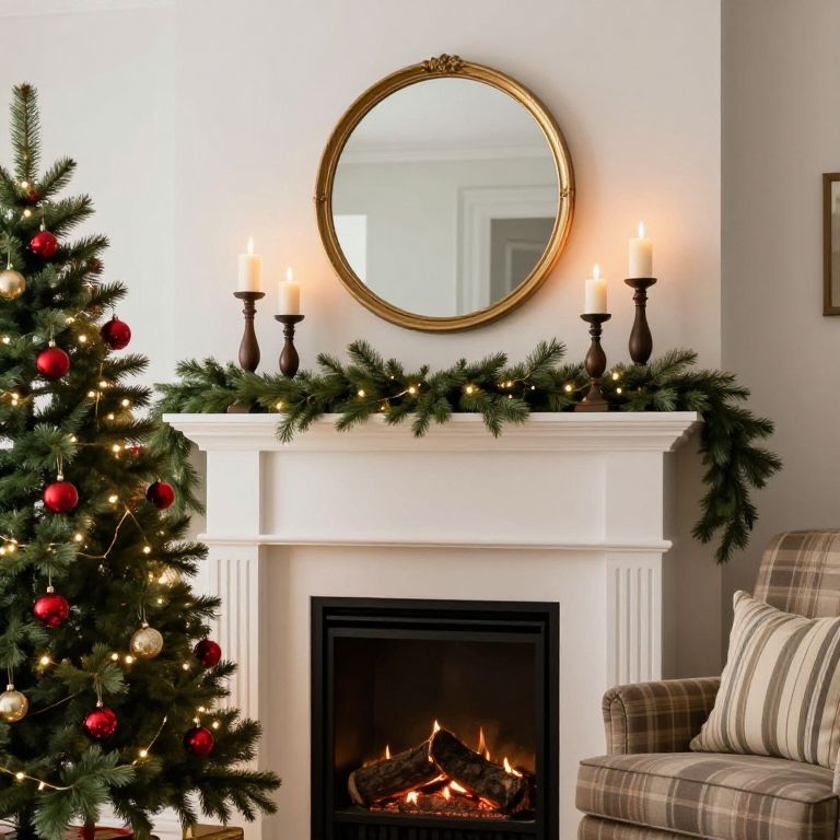 Cozy fireplace mantel adorned with festive green garland, four dark wooden candlesticks holding lit white candles, and a gold-framed circular mirror above, complemented by a Christmas tree decorated with red ornaments and twinkling lights to the left, and a plaid armchair with striped cushions to the right.