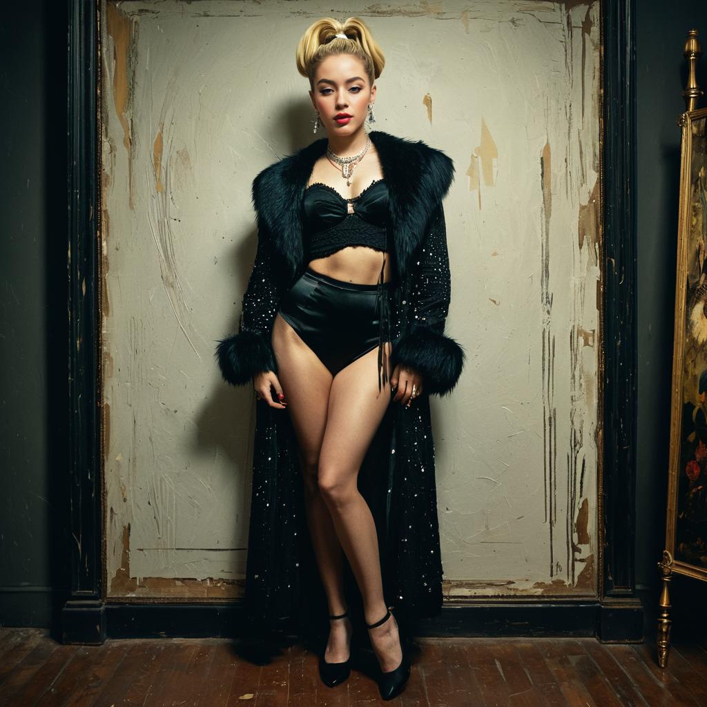 Props beautiful jeremy mann + matthäus merian the elder + olivia de berardinis + vargas , full body portrait of a perfect mix of [miley cyrus and jojo siwa ] as a the most beautiful 1930s femme fatale in the world, , hyper-feminine, pronounced feminine features, standing in a all girl speakeasy, volumetric lighting , oil painting, brush strokes, colorful,