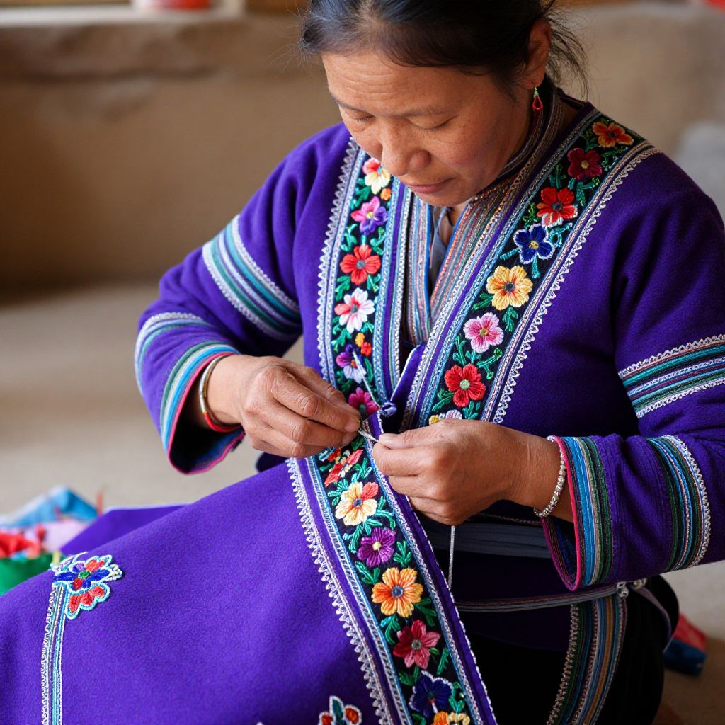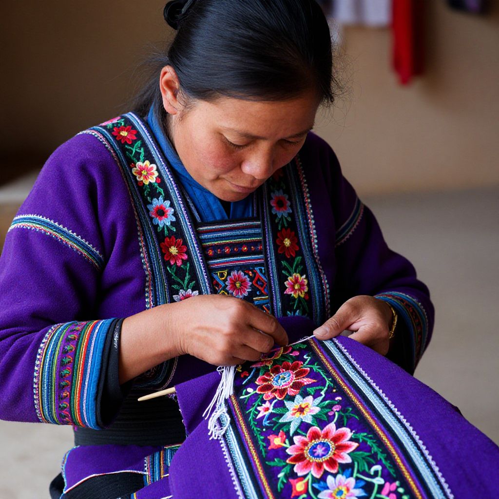 Hmong woman meticulously crafting intricate embroidery on a vibrant purple traditional garment, showcasing detailed floral patterns along the edges.