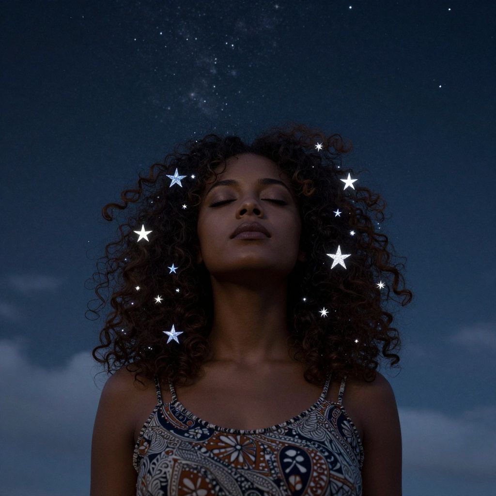 In this captivating image, a woman with voluminous, curly hair adorned with sparkling stars stands against a starry night sky. Her eyes are gently closed, exuding a sense of tranquility and serenity. The woman's skin is a rich, dark hue, complementing the celestial background. She is wearing a patterned top that adds a touch of elegance to her appearance. The stars in her hair and the night sky create a magical, almost ethereal atmosphere, as if she is ascending into the heavens. The overall composition is balanced, with the woman's figure centrally positioned, and the stars and clouds adding depth and dimension to the scene. The interplay of colors, textures, and shapes creates a harmonious and visually striking image that evokes a sense of wonder and contemplation.