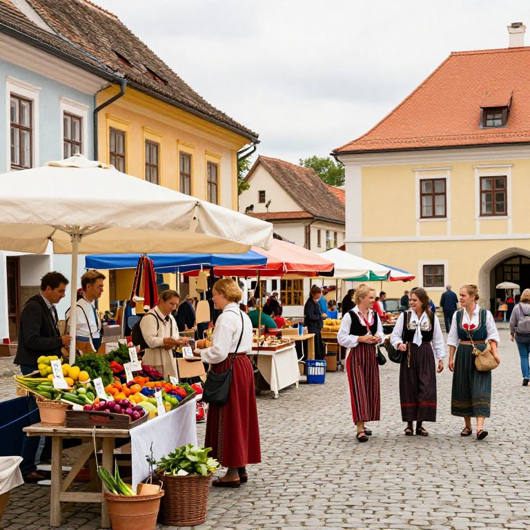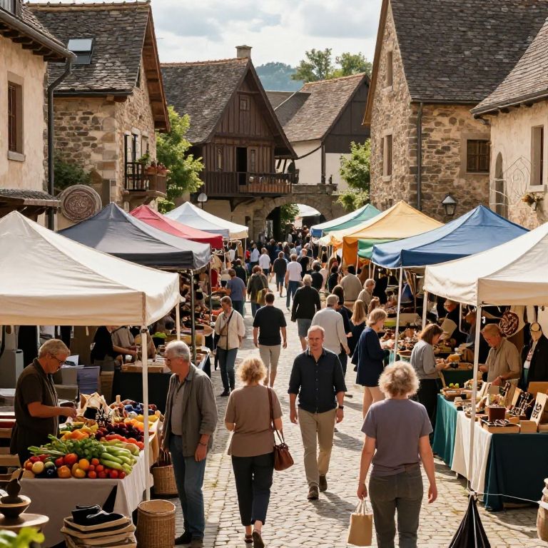 Photograph of a bustling outdoor market in a quaint, stone-walled village. Colorful tents line both sides of a cobblestone street, displaying fresh produce, crafts, and other goods. Shoppers, including elderly and middle-aged individuals, walk through the crowd. The market stalls have vibrant awnings in white, blue, green, and red. The background features charming, rustic buildings with wooden and stone facades, and a clear, sunny sky overhead. The scene is lively, with people engaging in shopping and conversation, creating a vibrant, community-focused atmosphere.