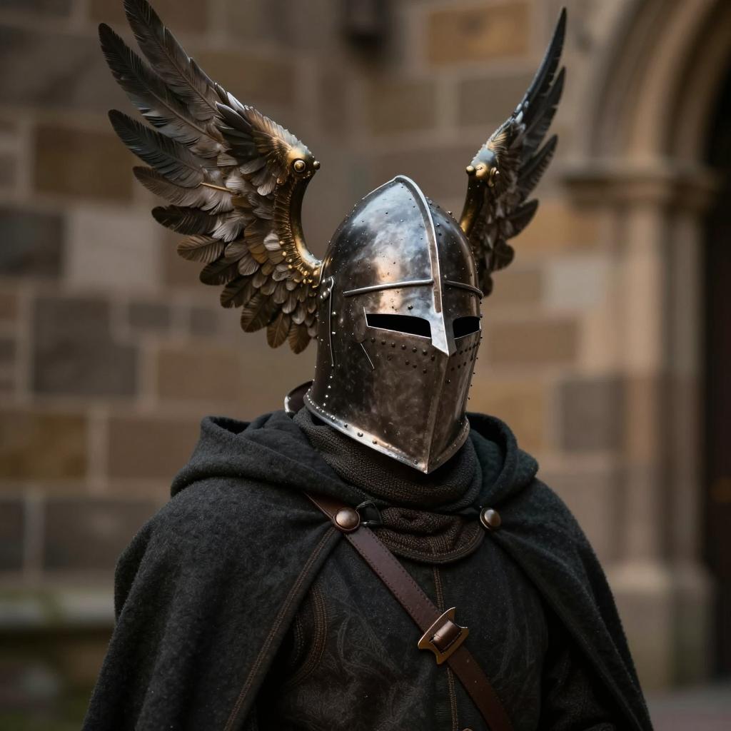 Portrait of a medieval knight wearing a dark metal helmet adorned with large, feathered wing-like crests. The knight is dressed in a dark cloak with a leather strap across the chest. The background features blurred brown stone bricks, creating a historic and atmospheric setting. The knight's face is completely obscured by the closed helmet.