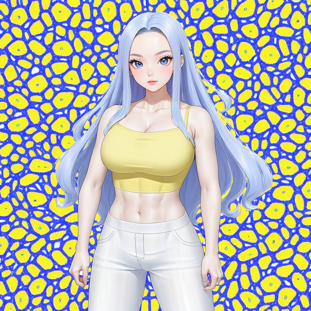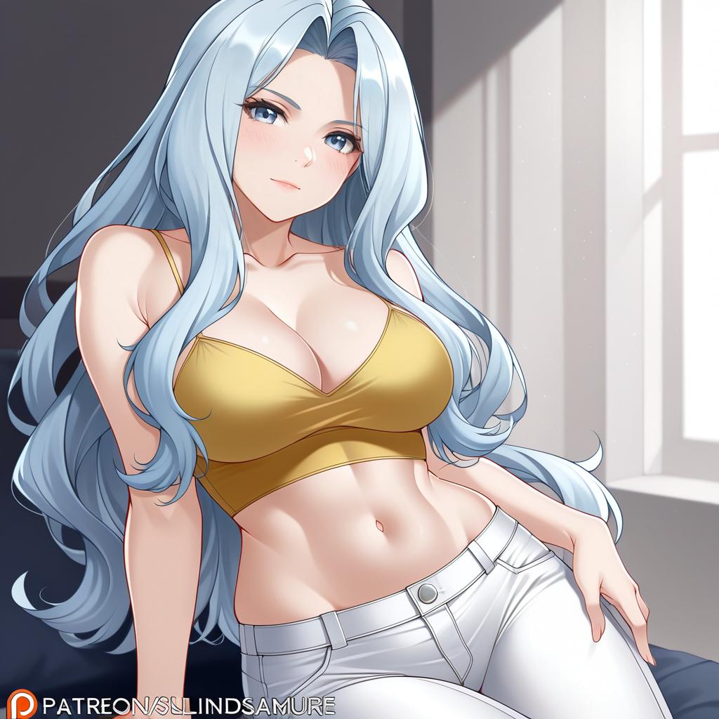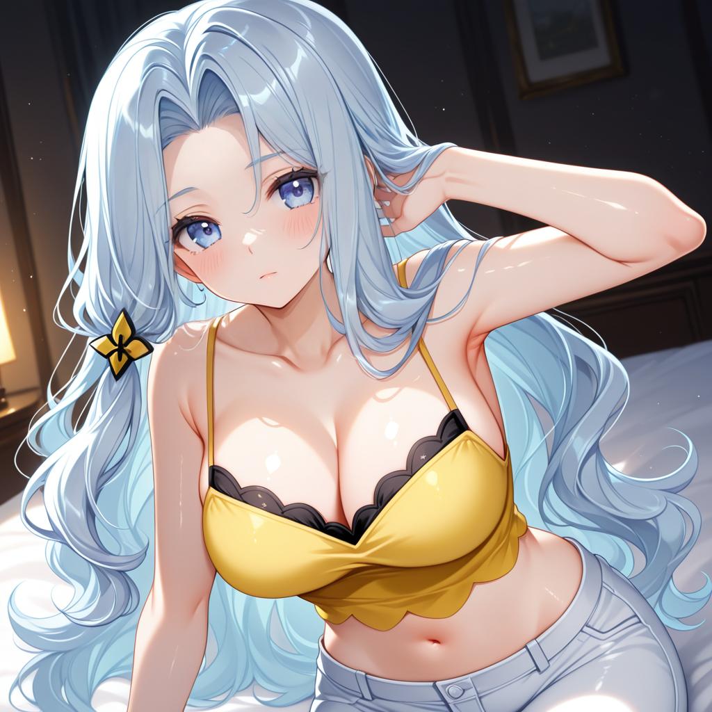 Karen (pokemon), pokemon, 1girl, blue eyes, grey eyes, long hair, wavy hair, light blue hair, grey hair, parted bangs, large breasts, cleavage, navel, collarbone, yellow shirt, capri pants, white pants, bare shoulders, bare arms, crop top, midriff, spaghetti strap, yellow camisole, by artist mudou eichi, dark_illustrious