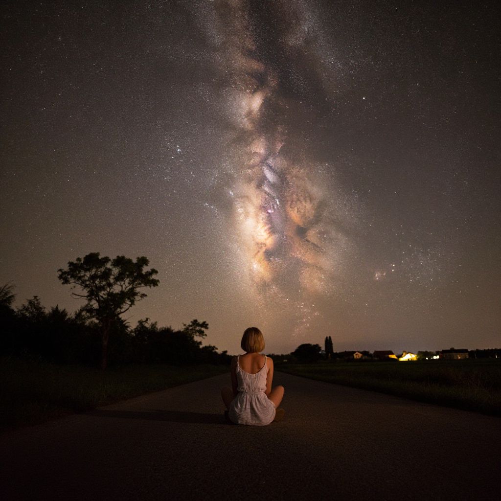 A contemplative and cinematic scene of a young woman with short blonde hair, sitting on a quiet rural road beneath a magnificent starry sky, The Milky Way arcs above her, its vibrant colors glowing brilliantly, while the surrounding silhouettes of trees and faintly illuminated houses add depth and mystery, The warm tones of her surroundings blend seamlessly with the cool hues of the cosmos, emphasizing the harmony between the human figure and the vast universe, The image captures a perfect balance of wonder, tranquility, and introspection