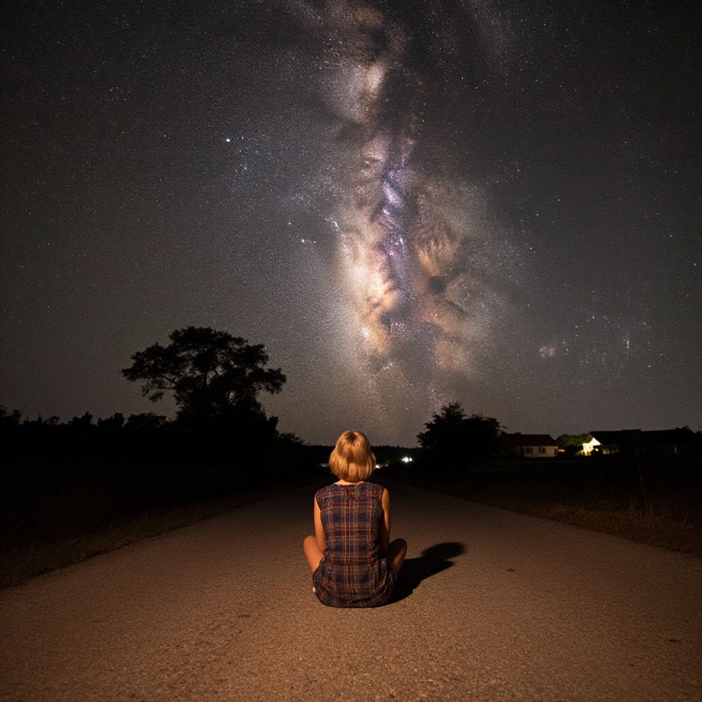 Photograph of a blonde woman in a plaid dress, sitting on a dark road, gazing at a vibrant Milky Way galaxy above, with sil