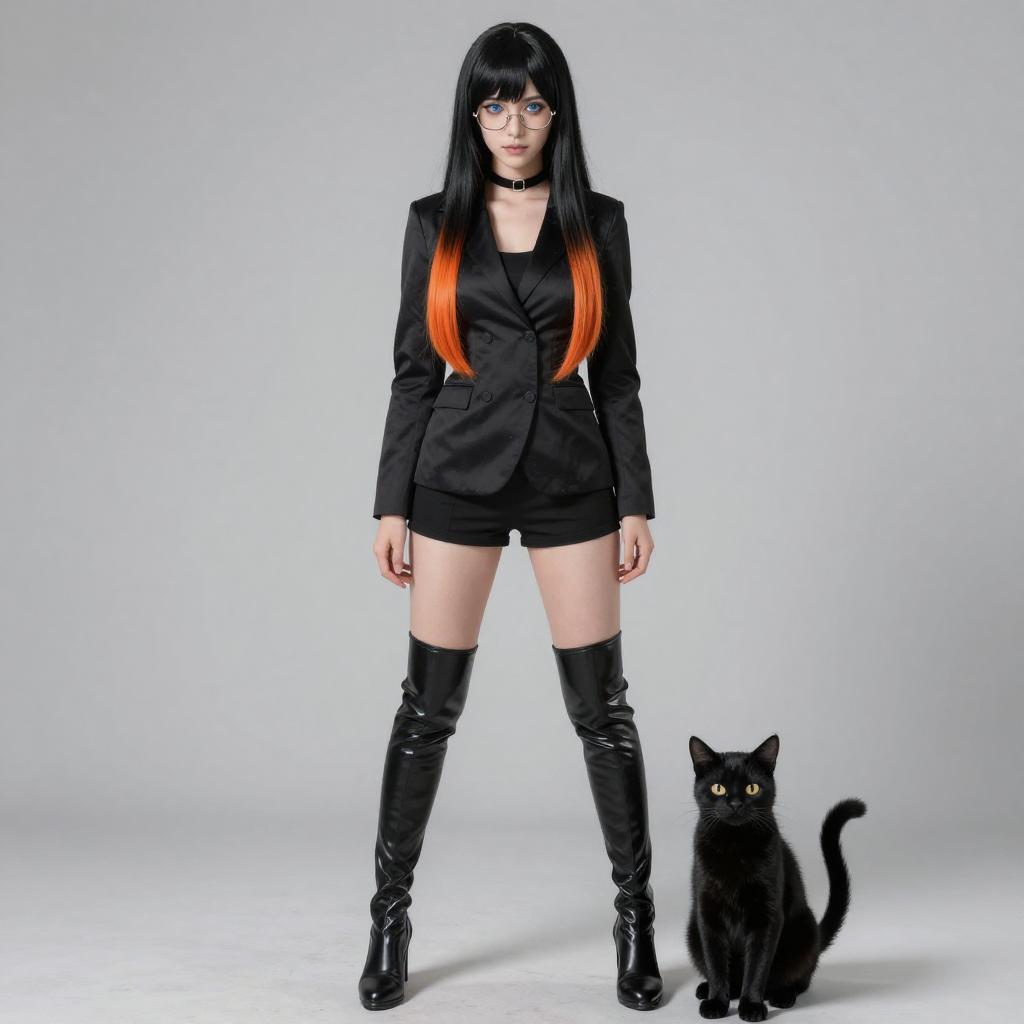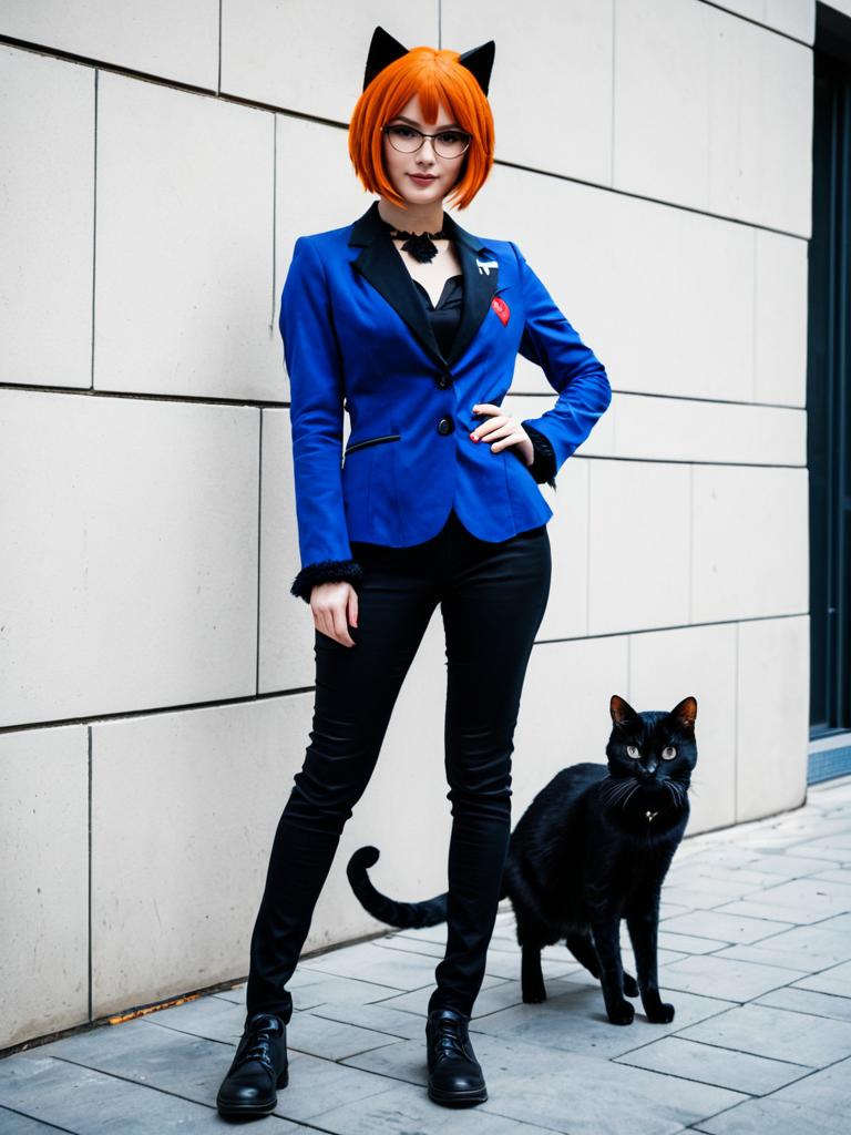 Photo-realistic cosplay photo of person standing in morgana (persona 5) costume. blue eyes, glasses, long hair, short hair, black hair, orange hair, long sleeves, cat, black cat, animalfull body shot. lifestyle stock photo, shallow depth of field, lifestyle stock photography, shallow depth of field, natural lighting, warm tones, soft background blur, vibrant colors, realistic textures, professional photoshoot