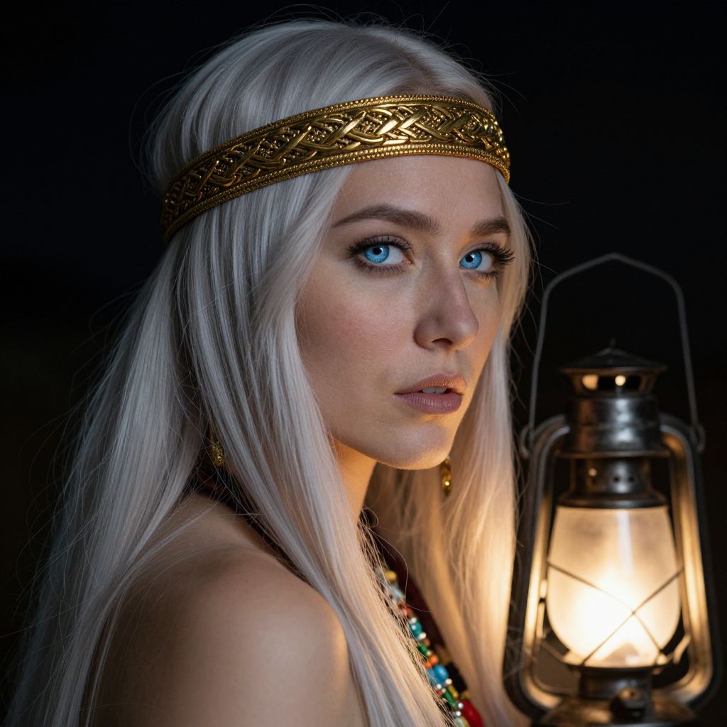 Photograph of a fair-skinned woman with long white hair, blue eyes, gold headband, and necklace, illuminated by a vintage lantern.