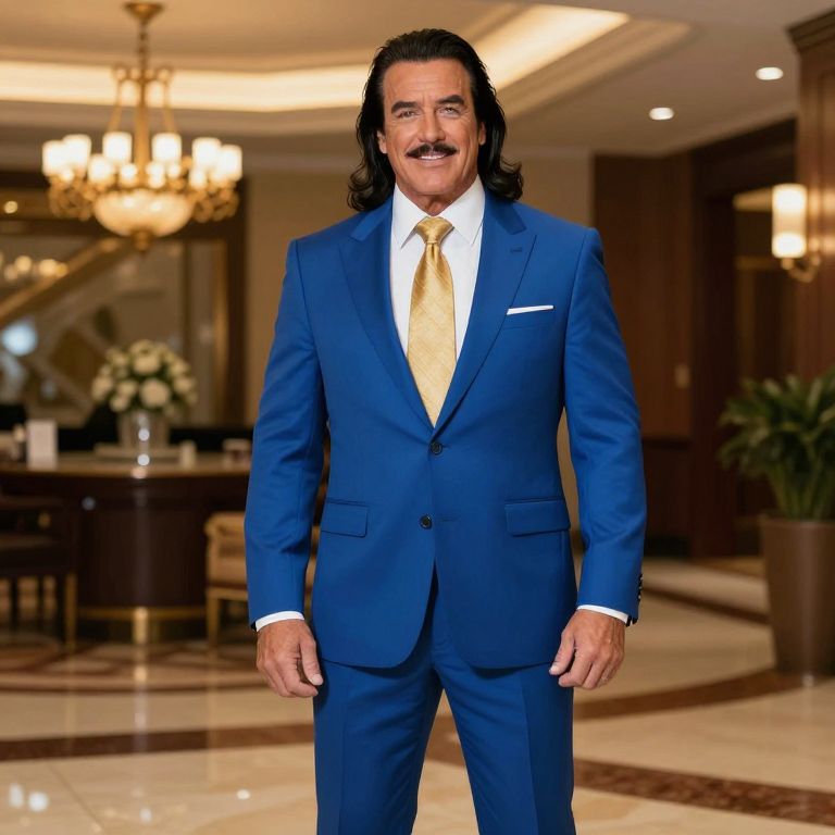 Ric Flair Fancy Dress, dressed in a blue suit and gold tie standing in a lobby