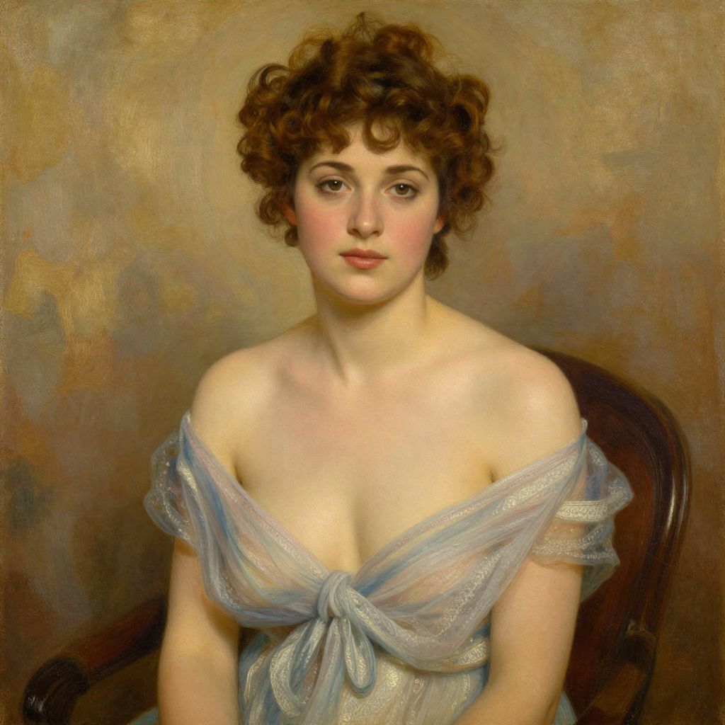 A vintage-inspired oil painting featuring a woman with classic curls, adorned in a delicate off-the-shoulder dress, exuding a timeless elegance with soft, warm lighting and a retro aesthetic reminiscent of Suzanne Valadon's style.