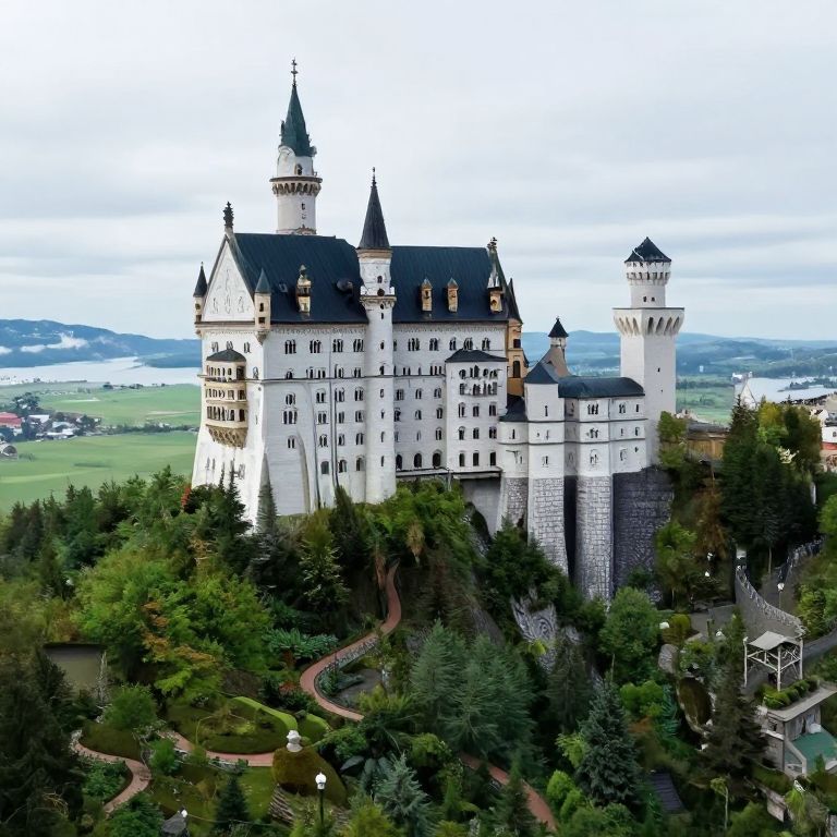 Spectacular castle perched atop a floating island, surrounded by lush greenery and encircled by a winding pathway, rises majestically above the clouds, its multiple spires and grand archways reflecting a serene yet ethereal atmosphere.