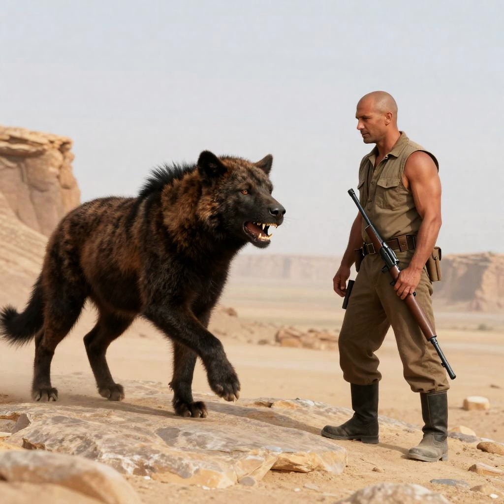 Photograph of a muscular man with a bald head, wearing a sleeveless shirt, pants, and boots, holding a rifle in his right hand. He stands on a rocky desert landscape, looking at a large, aggressive creature with dark fur and a striped pattern. The creature is mid-step, facing the man. Rocky formations and a distant horizon dominate the background. The man's expression is focused, while the creature's expression is intense.