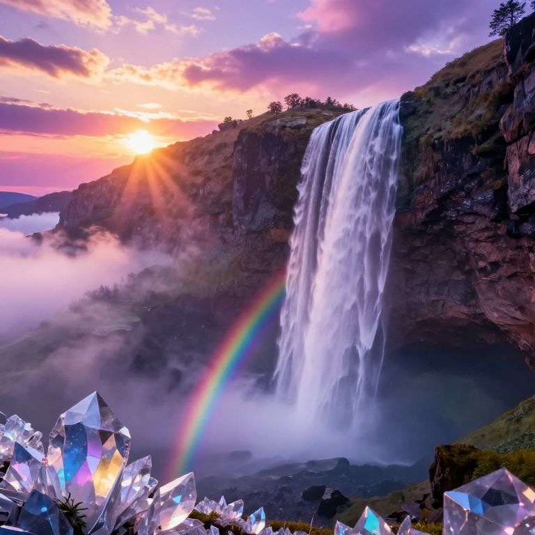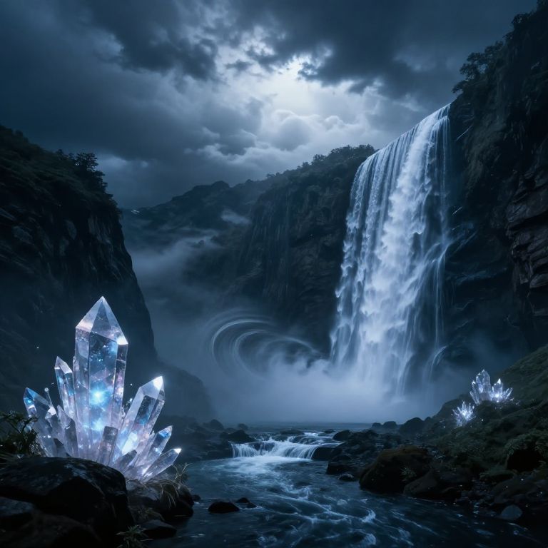 Mana remana swirling in a stormy mountain valley, waterfalls made of light, crystal formations glowing with inner energy, dramatic skies, fantasy realism, cinematic composition, Dall-E style