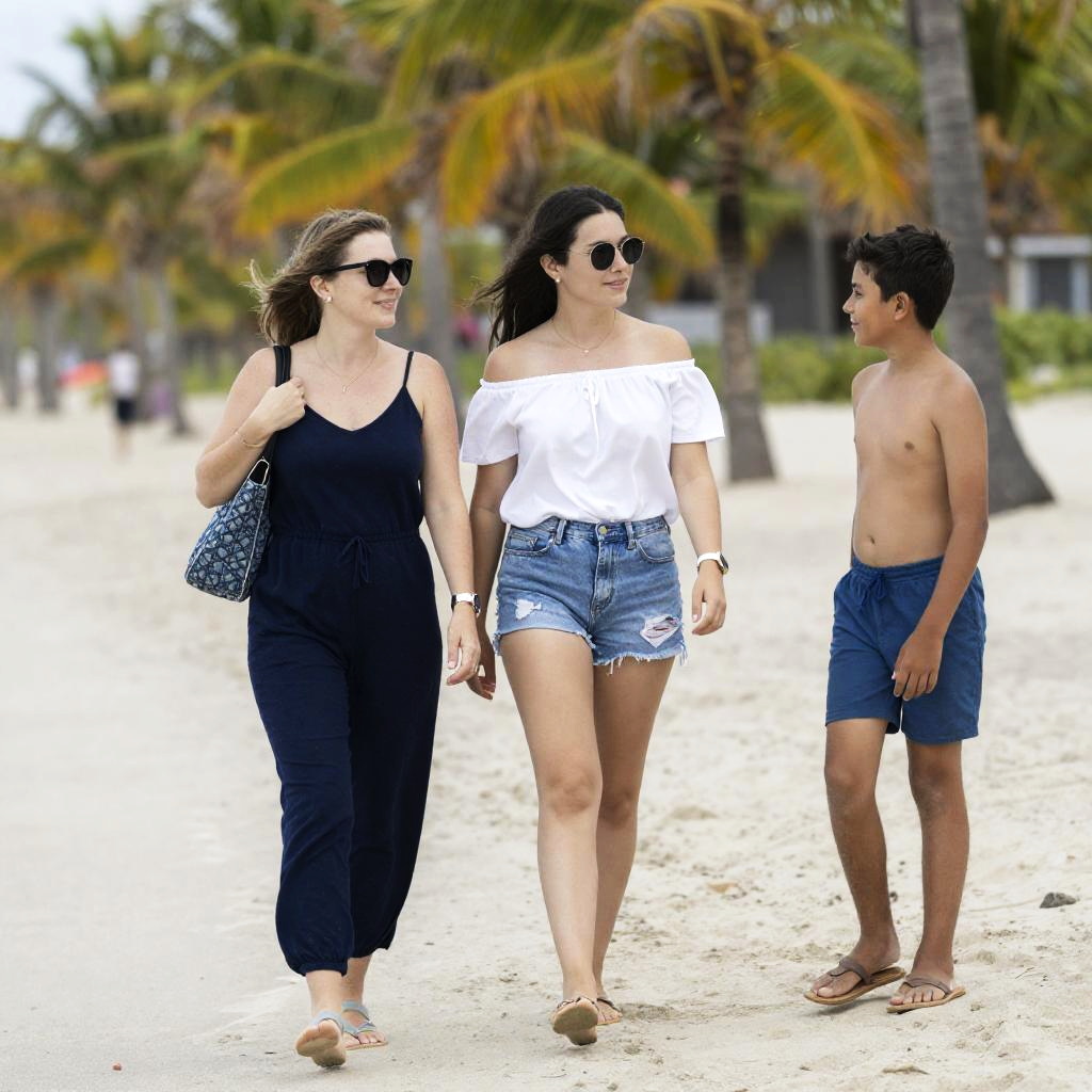 Photograph of three people on a sandy beach with palm trees in the background. Two women walk together; one wears a dark blue jumpsuit with sunglasses and a blue patterned bag, the other wears a white off-shoulder top and denim shorts with sunglasses. A shirtless boy stands to the right, facing them. All three have smiles.