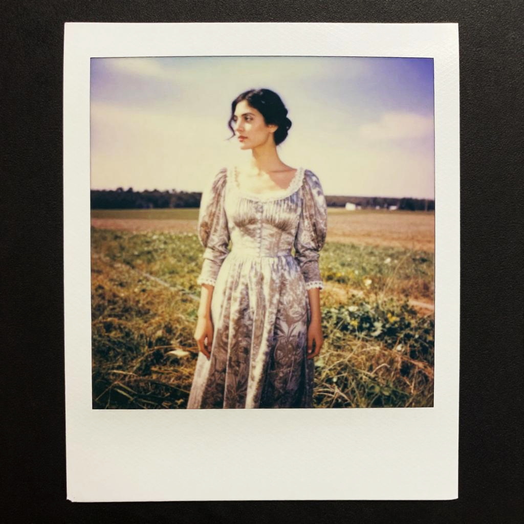 A woman in an artistic Polaroid-style photo, wearing a vintage long-sleeve dress stands amidst a pastoral setting, evoking a sense of timeless elegance.