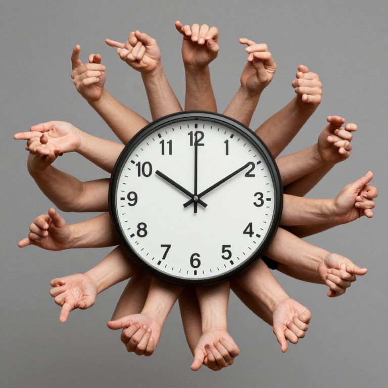 A surreal assembly of outstretched arms forms a ring around a central clock, each hand frozen in a unique gesture, defying the unity of time and creating a paradoxical dance of individuality against the backdrop of shared moments.