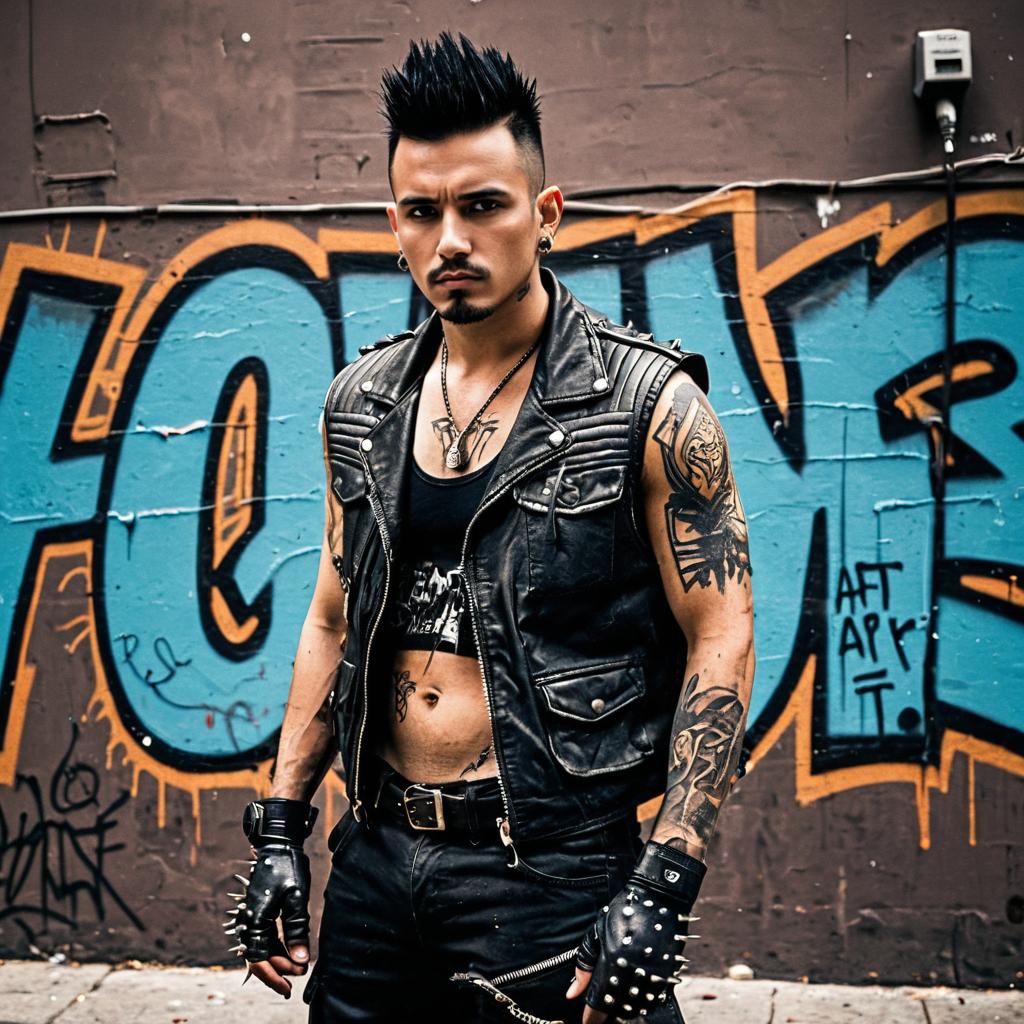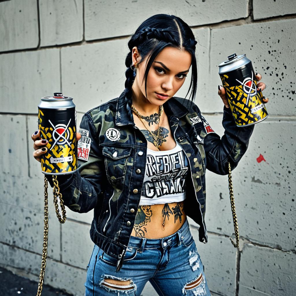 A hustler female realistic mural with buzzcut black hair, blue eyes revealing scar on cheek, headphones, and sports hoodie with cargo pants, leaning forward with hands clenched, metro grind, gold wristwatch, solo.