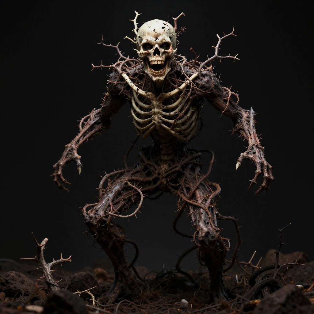 Full body, solo, gnarled humanoid entwined by thorned vines, with a shattered skeletal face, branches reaching out, teeth baring, looking at viewer, writhing upward from a pit of shadows, feral agony mixing rage and despair, black background
