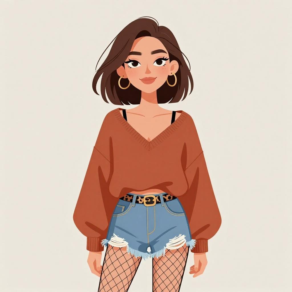 Woman with pretty face and pretty hair. smiling Woman, casual streetwear, oversized terracotta sweater with a deep V-neck, drop shoulders, light-wash blue denim shorts with frayed hem, black fishnet tights, thin belt with leopard print, simple studio background --sref 1467