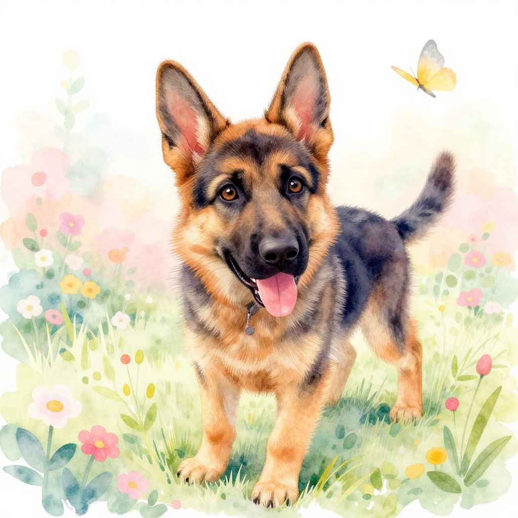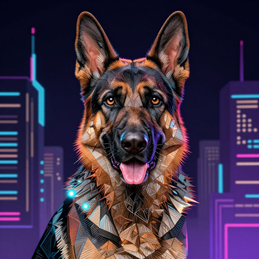 Digital drawing of a German Shepherd with detailed fur texture, sitting against a black background with a city skyline silhouette.