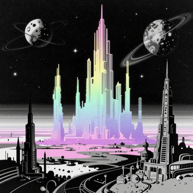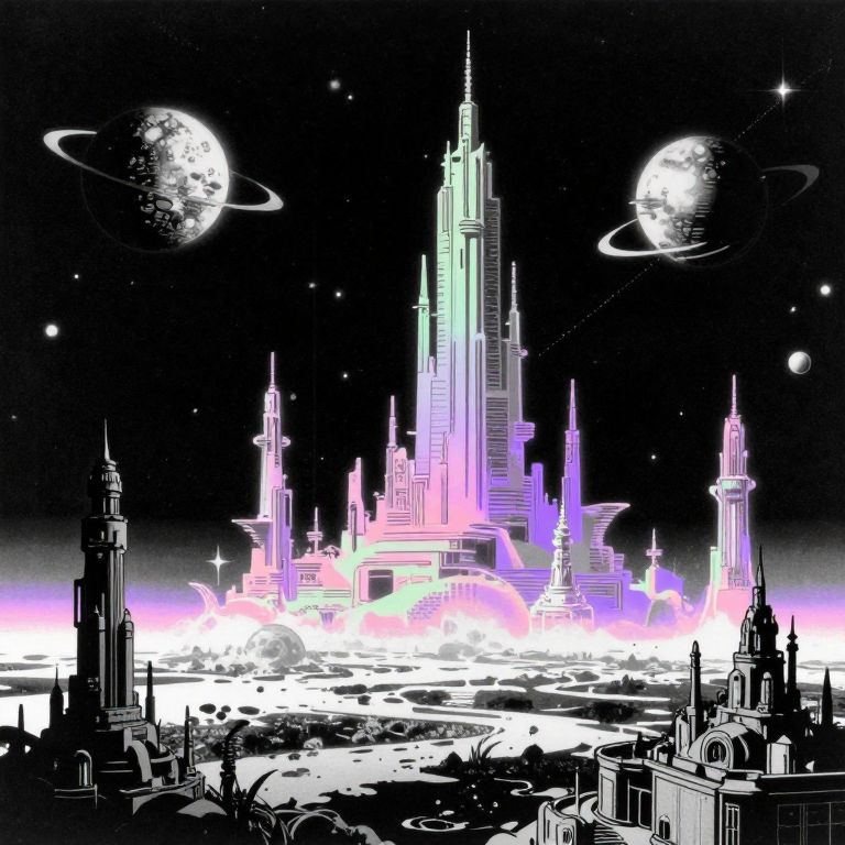 Monochrome with color, retro scan of 80s-anime-ai spectral neon Gradient asciiart, a 80s Sci-fi Ethereal, Dark space, 80`s sci-fi book artwork, lofi, neon-pastel colors, grainy, vintage Create a vivid description of a distant planet in the universe where enormous structures are visible from space, towering over the landscape in an awe-inspiring display
