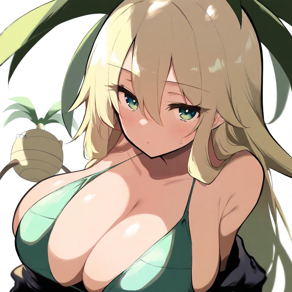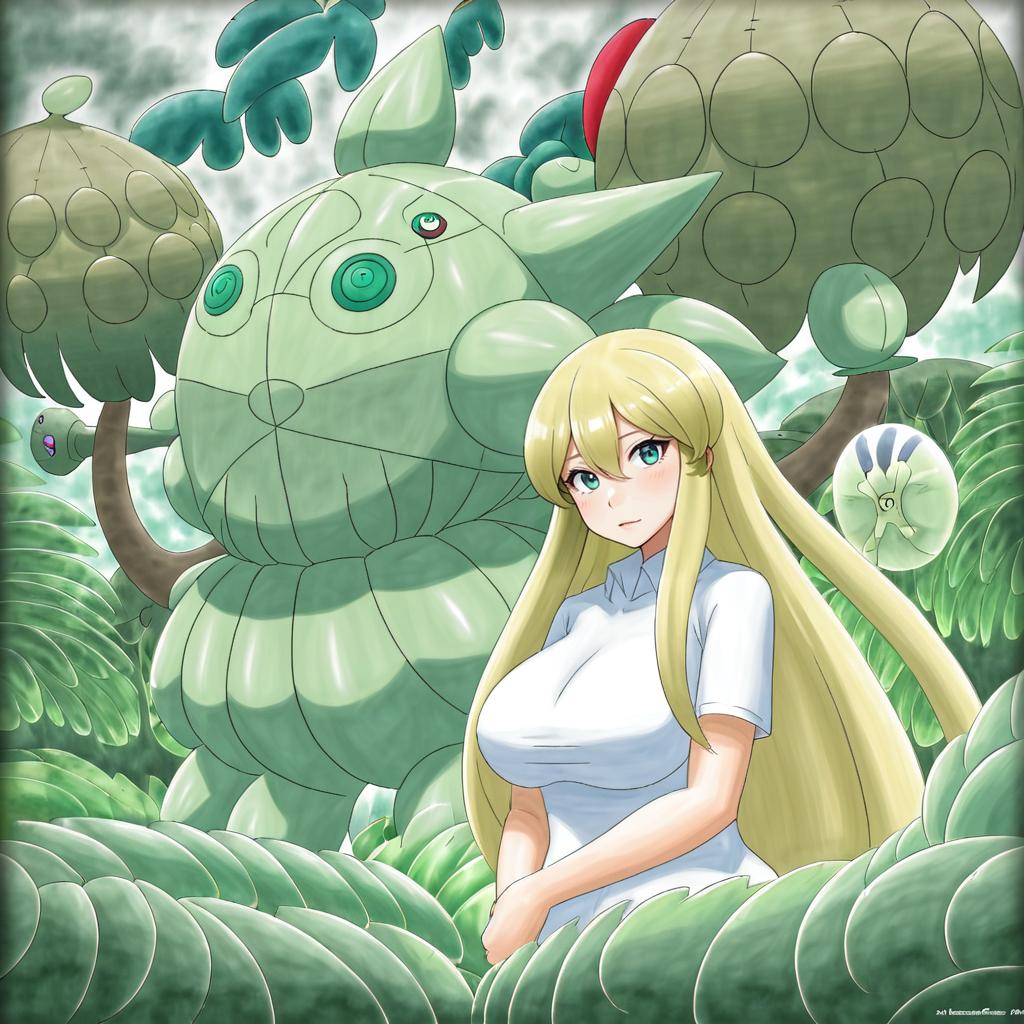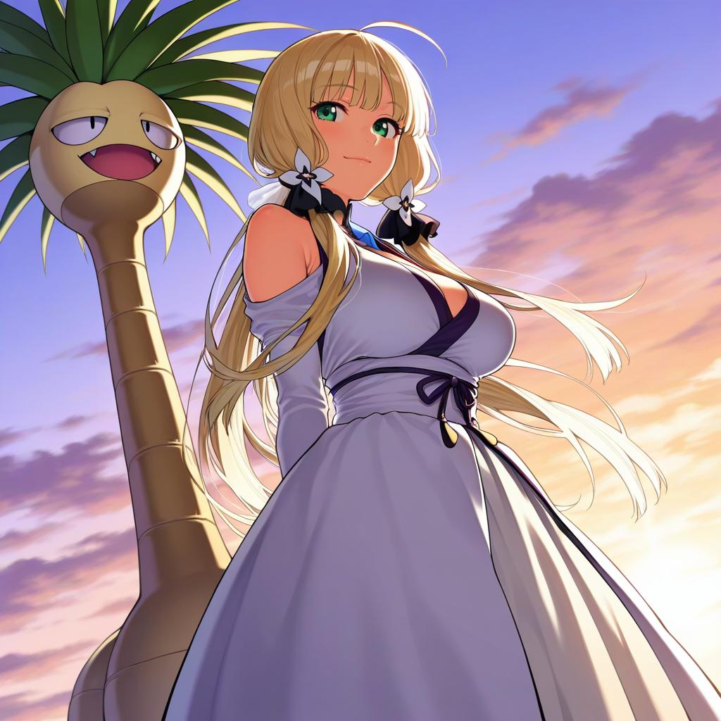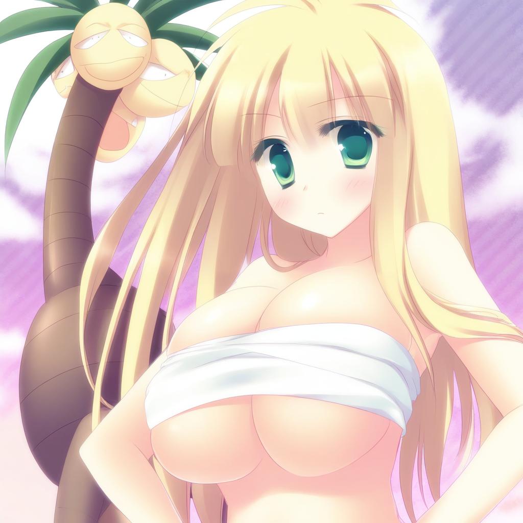 Alolan exeggutor, pokemon, 1girl, green eyes, blonde hair, long hair, large breasts, pokemon (creature), by artist kagachi saku, animagine