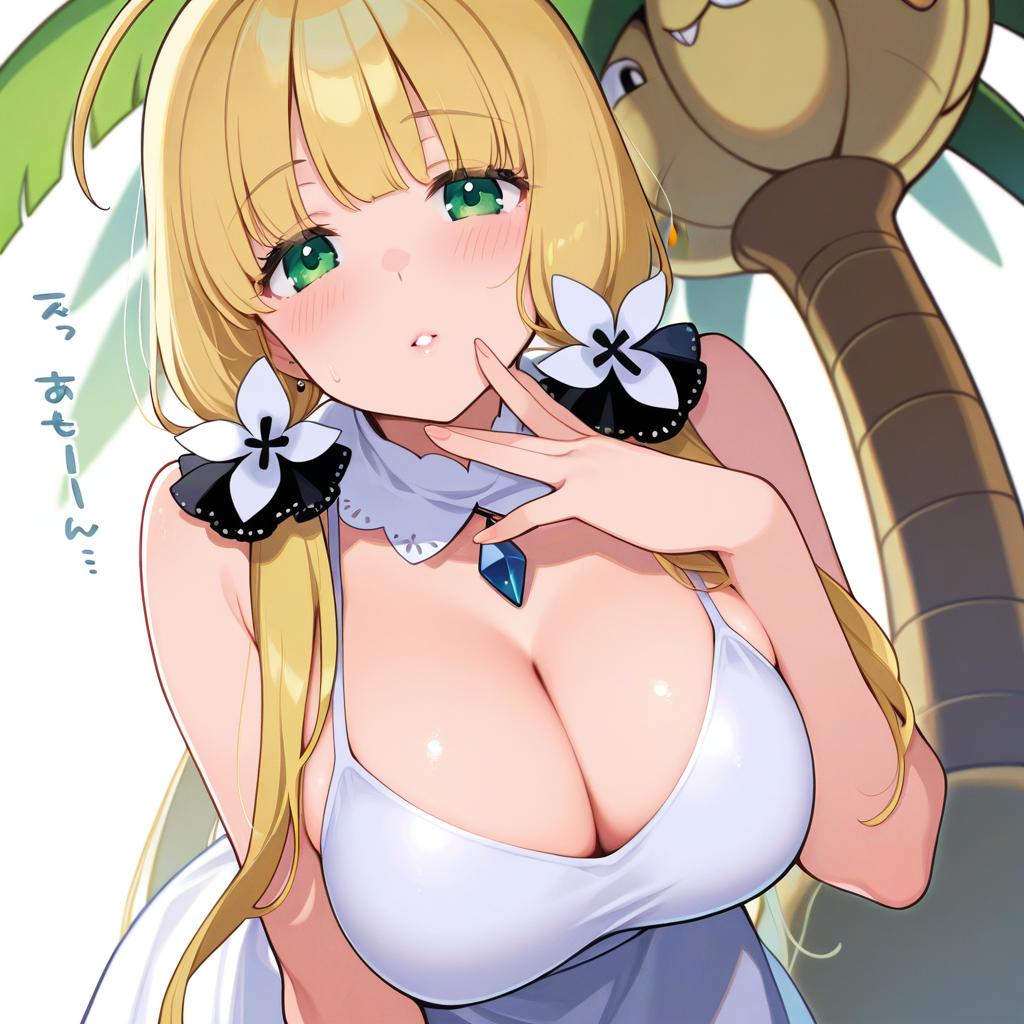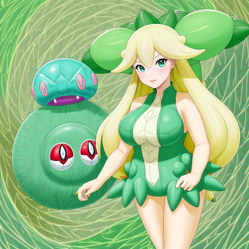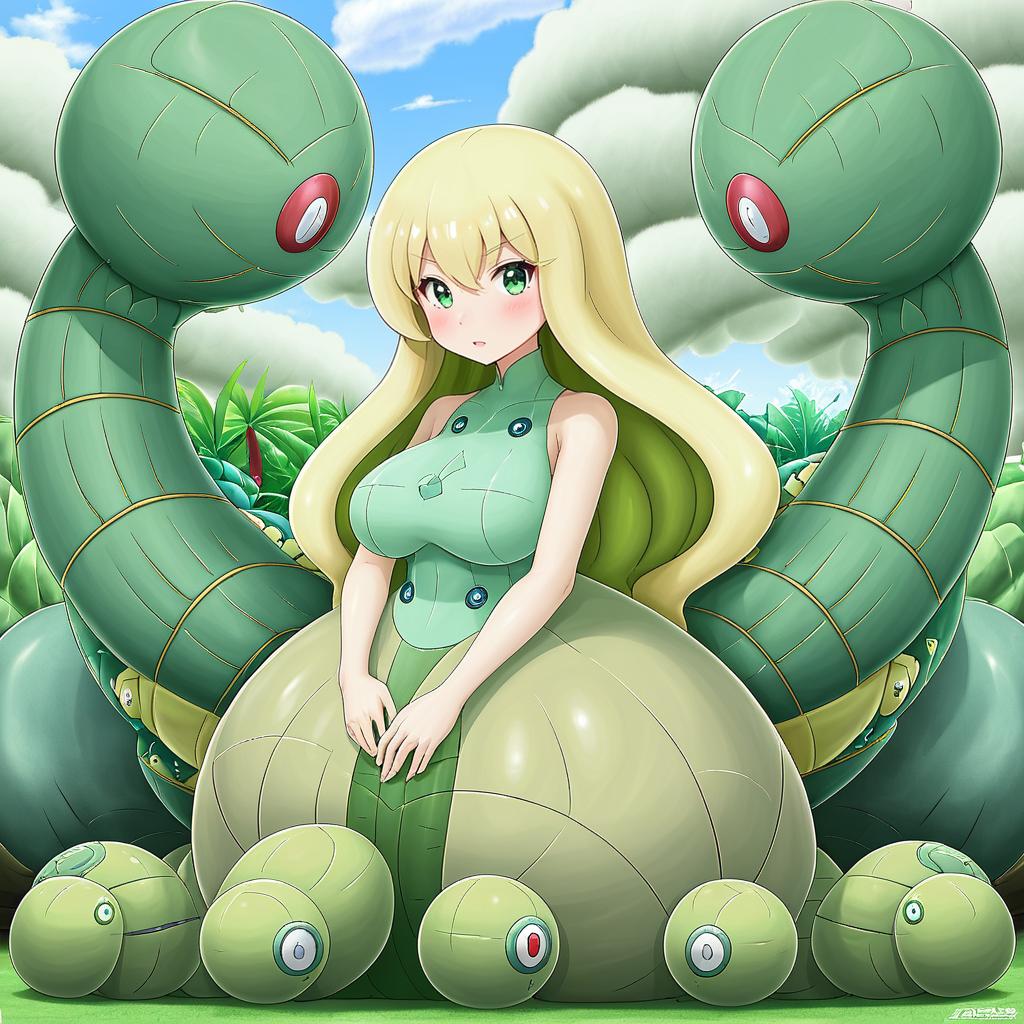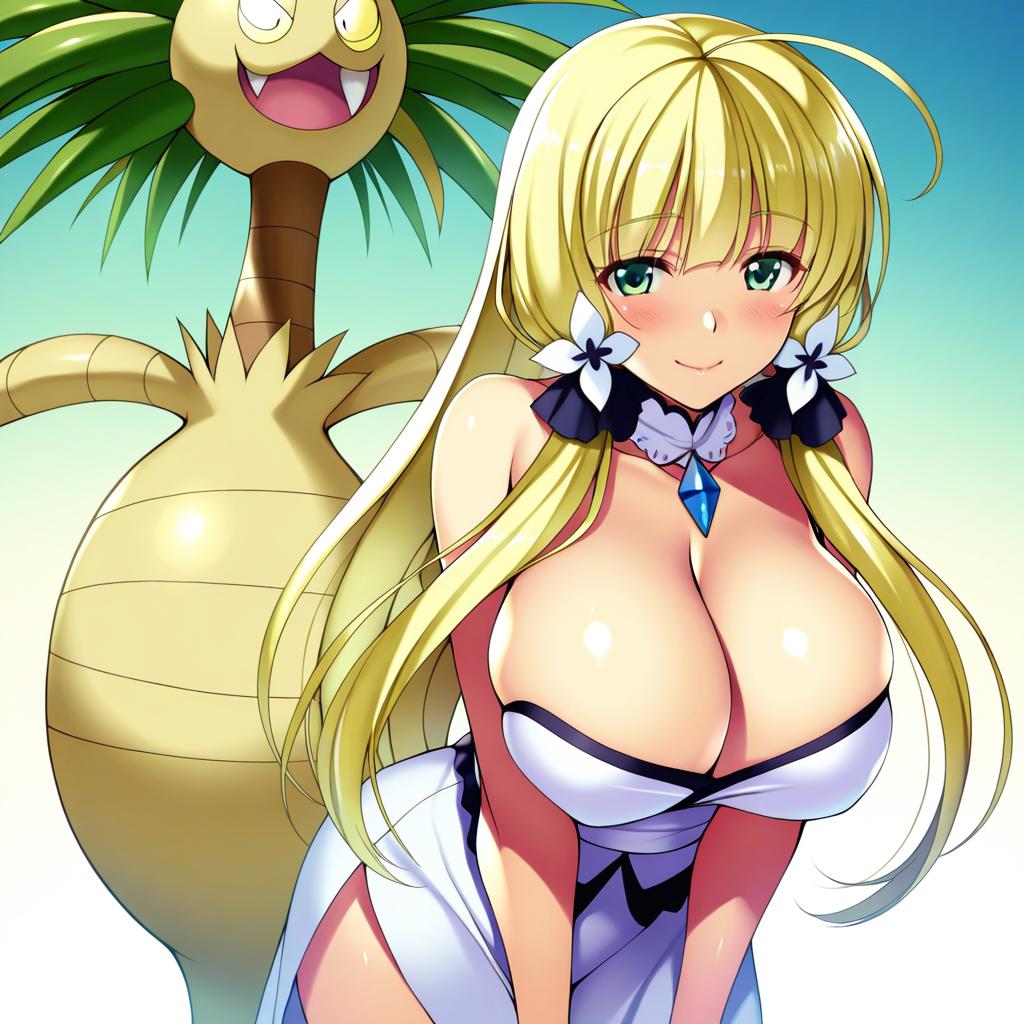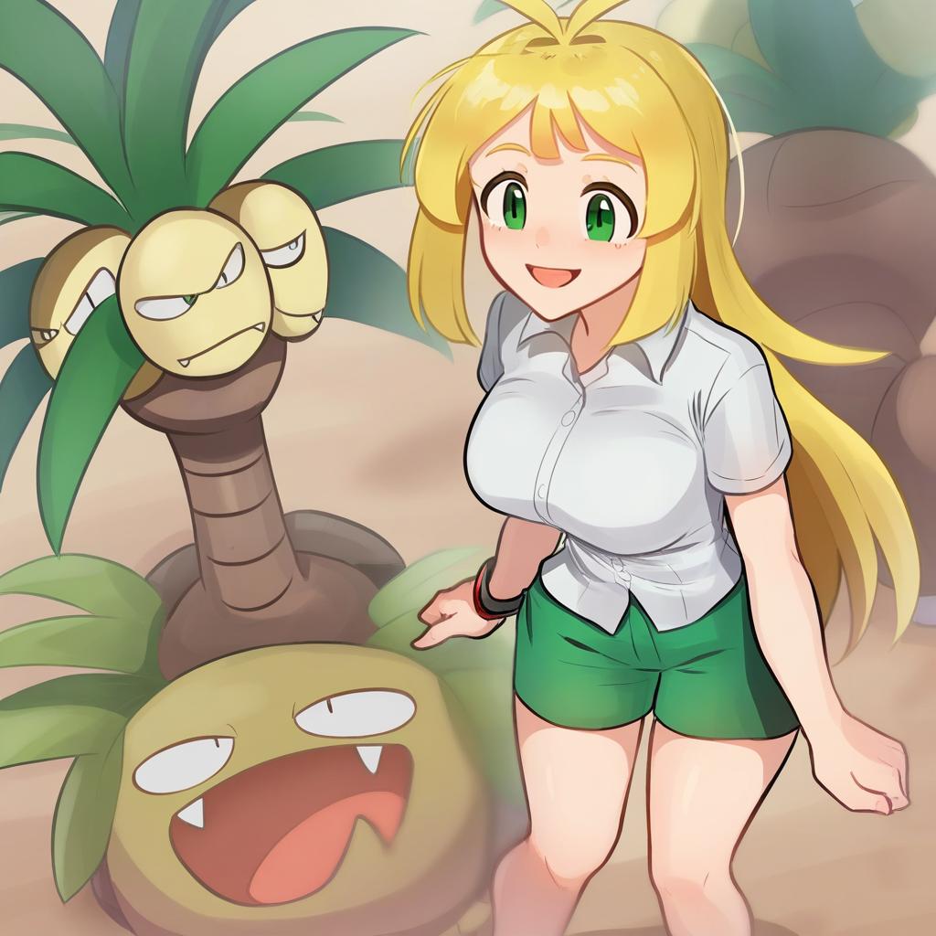 Alolan exeggutor, pokemon, 1girl, green eyes, blonde hair, long hair, large breasts, pokemon (creature), by artist kagachi saku, animagine
