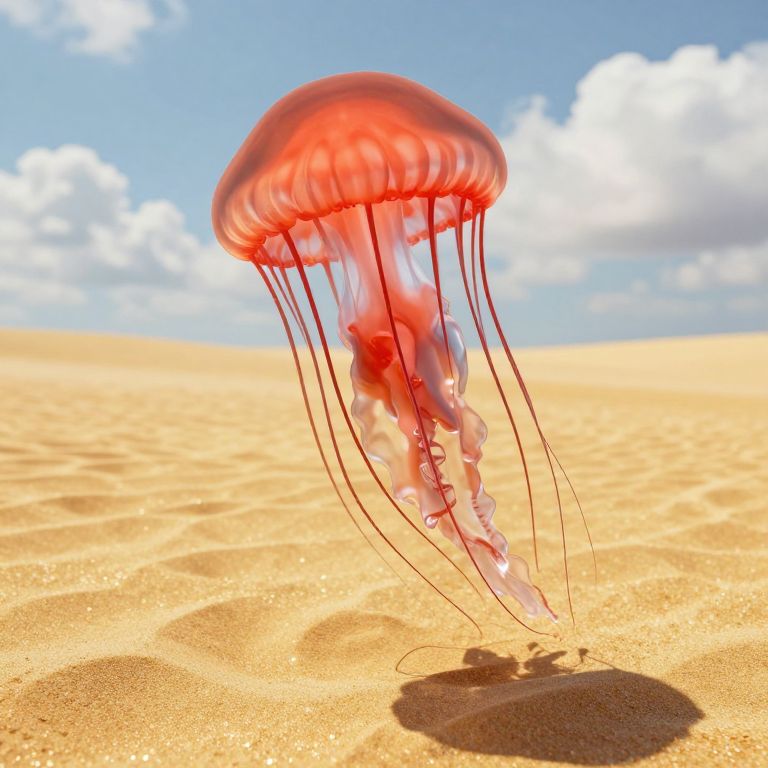 Photograph of a single, vibrant red jellyfish with translucent, wavy tentacles, floating above a vast, golden sandy desert. The jellyfish's dome-shaped bell is illuminated by sunlight, casting a shadow on the sand below. The background features a bright blue sky with scattered, fluffy white clouds, creating a stark contrast to the sandy desert. The jellyfish's delicate, flowing tentacles dangle gracefully, adding a surreal element to the arid landscape. The image captures the jellyfish in sharp detail, highlighting its ethereal beauty against the stark simplicity of the desert.