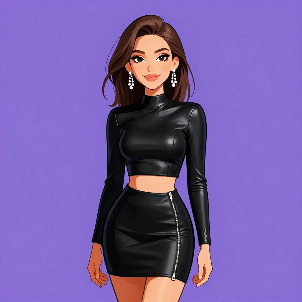 Digital illustration of a confident woman with long dark hair, wearing a purple checkered crop top, black leather pants, and large hoop earrings, against a