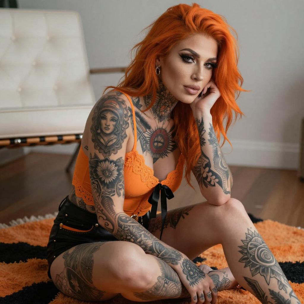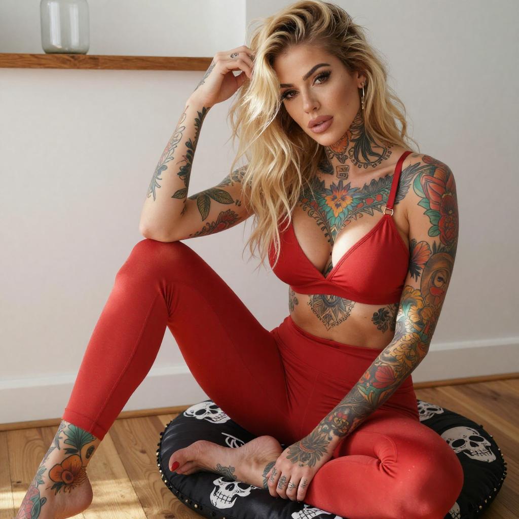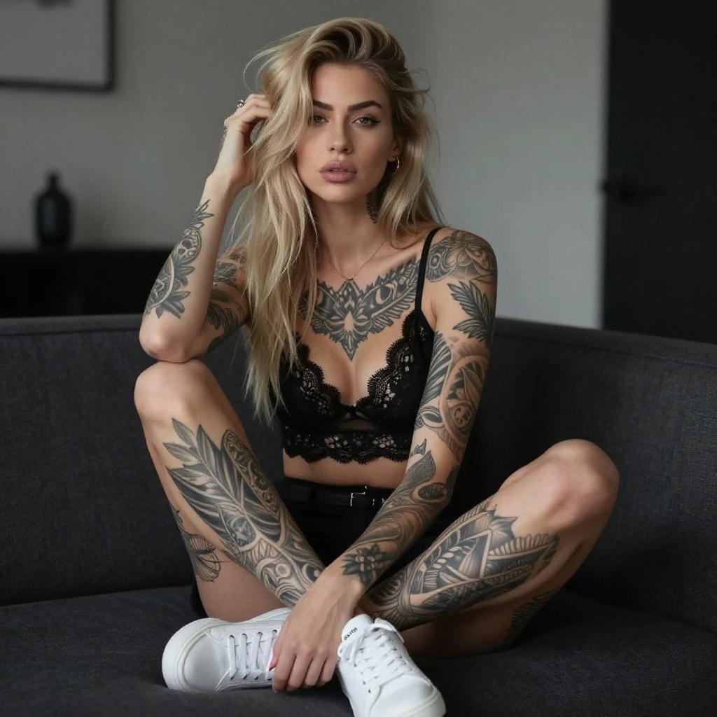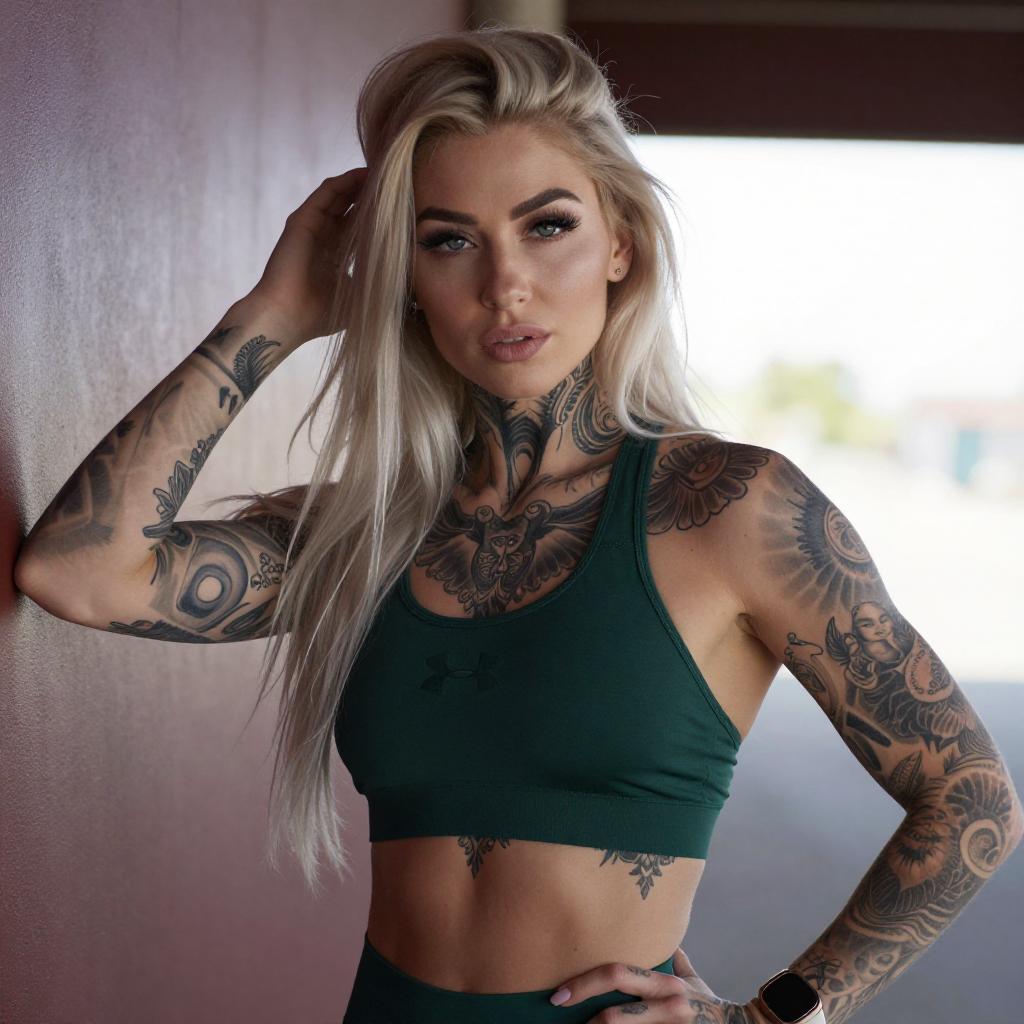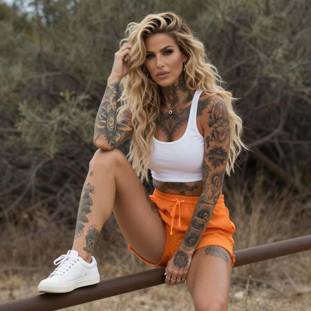 Photograph of a tattooed woman with long, wavy blonde hair, sitting on a metal railing. She wears a white crop top, orange shorts, and white sneakers. Her arms and legs are heavily tattooed with intricate designs. She has a confident expression, with one hand touching her hair. The background features dry, bushy vegetation.