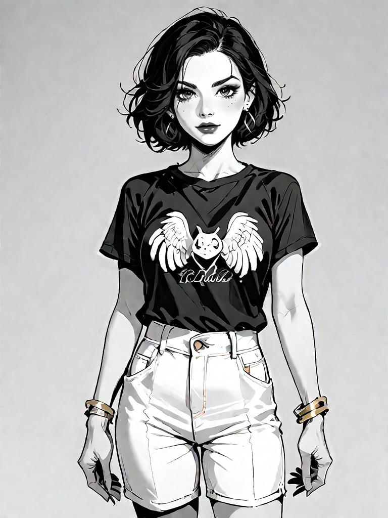 1girl, source_comics, realistic face, full body shot, Woman, chic, knee-length black dress with white piping, cap sleeves, scoop neckline, body-hugging silhouette, minimalist cuff bracelet.