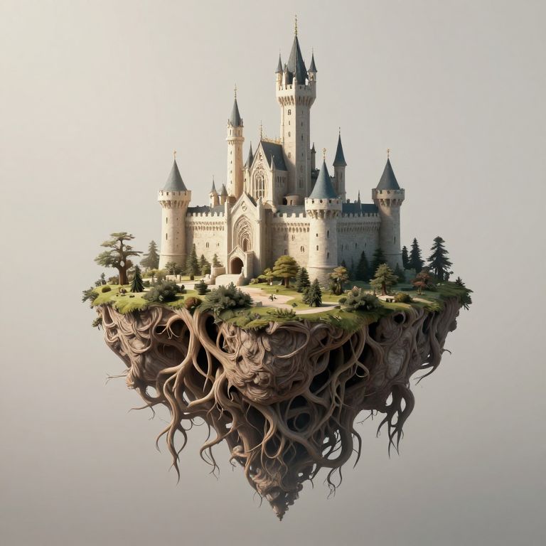 This digital illustration showcases a fantasy castle floating on a small, tree-covered island with extensive, gnarled roots extending downward. The castle features multiple tall, pointed spires and detailed Gothic architecture in shades of beige and gray. Green trees and bushes surround the base, while a reflective surface below mirrors the island and castle. The background is a gradient of white to light gray, emphasizing the floating island. The image has a realistic yet whimsical style, blending detailed textures with fantastical elements.