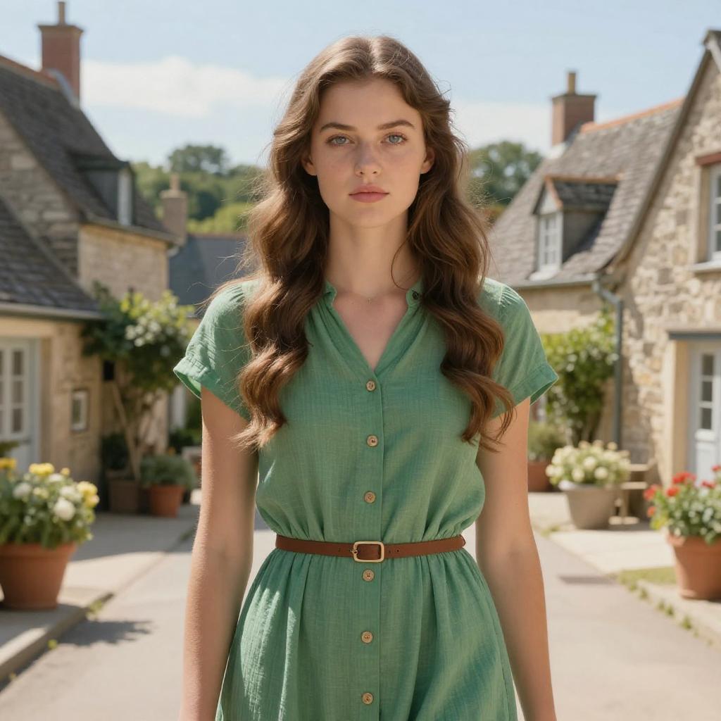 Photograph of a young woman with fair skin and long, wavy brown hair standing in a sunlit, quaint village street. She wears a green, short-sleeved, button-up dress with a brown belt and brown buttons. Her expression is neutral, with a slight hint of curiosity. The background features stone cottages with slate roofs, potted plants, and blooming flowers. The sky is clear, and the sunlight casts soft shadows. The overall atmosphere is peaceful and charming, reminiscent of a picturesque countryside setting.