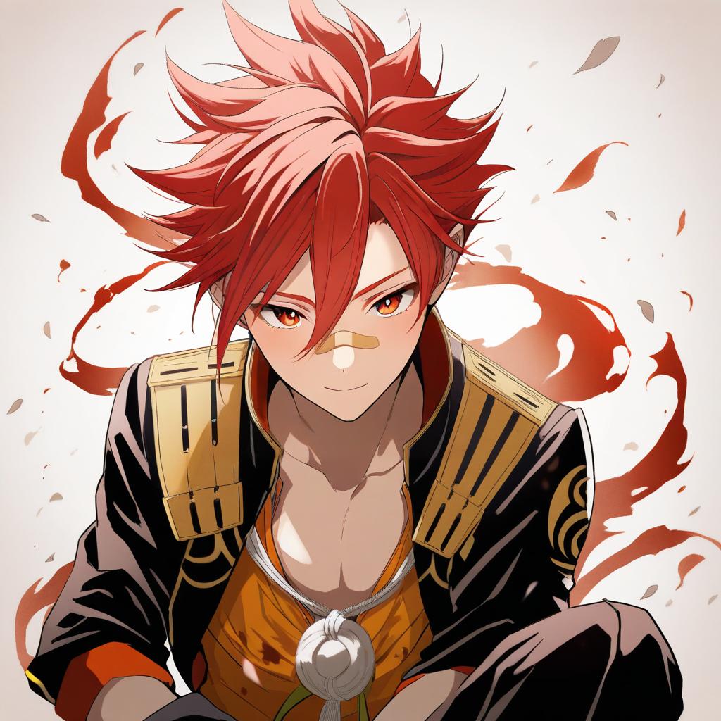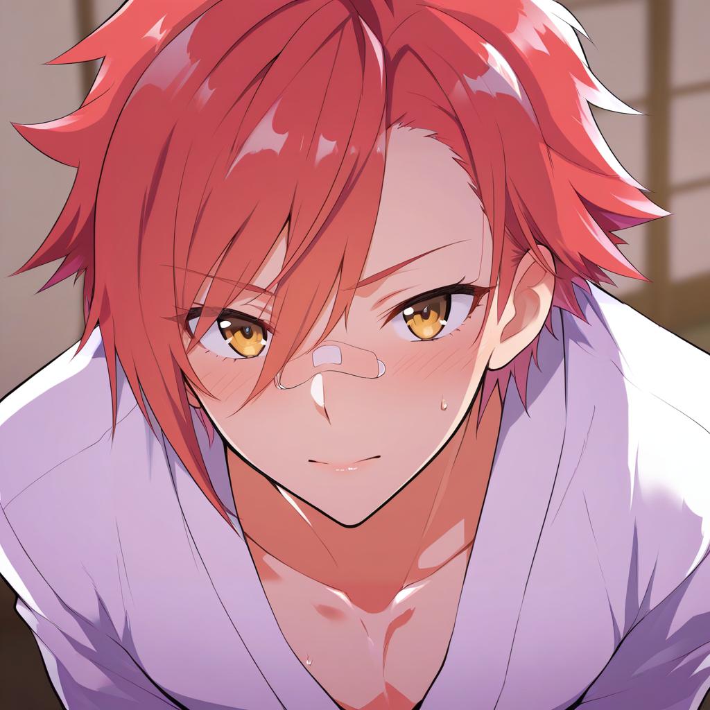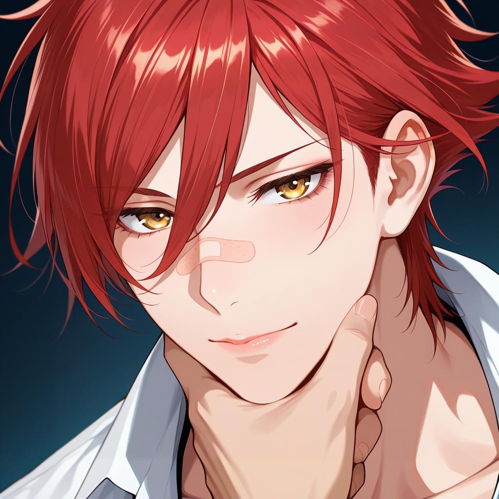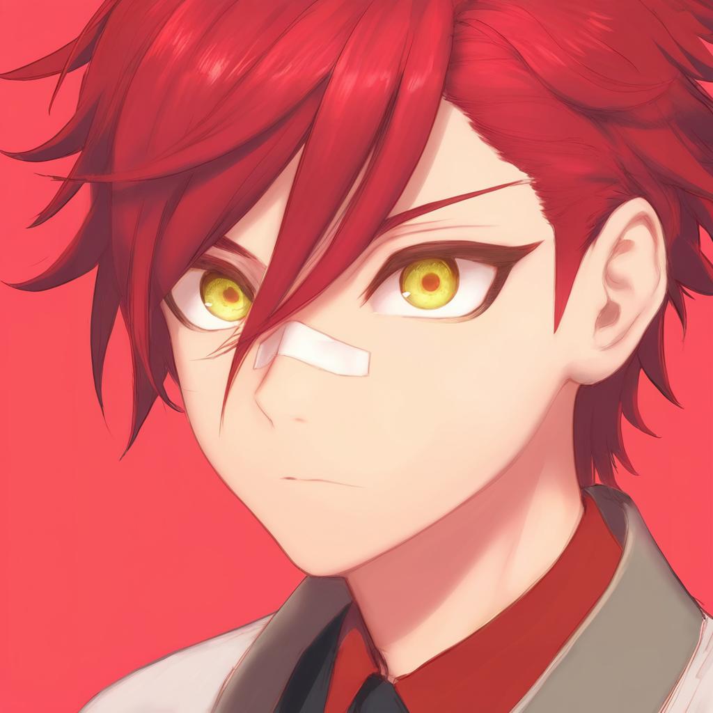 Digital illustration of a red-haired anime male character with striking yellow eyes and a bandaid on his nose. He is dressed in a traditional red garment with a white inner layer. The character poses with one arm resting on his knee against a plain grey background.