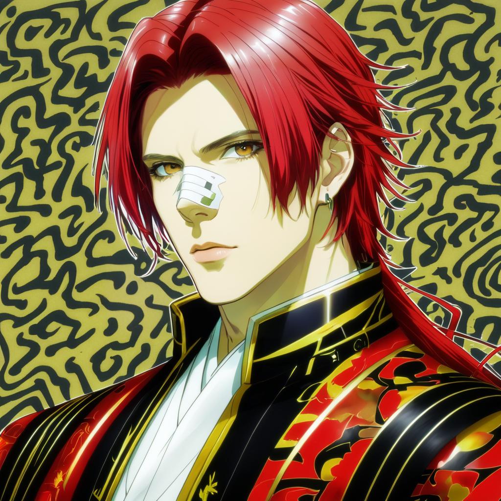 Aizen kunitoshi, touken ranbu, 1boy, yellow eyes, red hair, bandaid on nose, tantou, by artist nathaniel pennel, leet