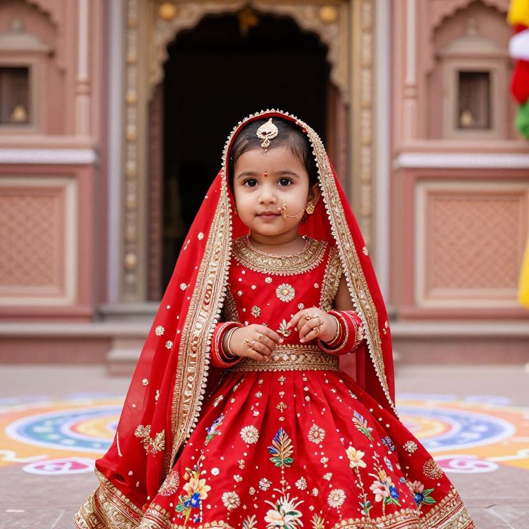 A graceful girl with fair complexion and large expressive eyes, wearing a beautifully crafted baby Radha red dress with floral patterns and gold thread detailing, posing in front of a historic temple entrance with traditional rangoli patterns in the background during a cultural festival in Rajasthan.