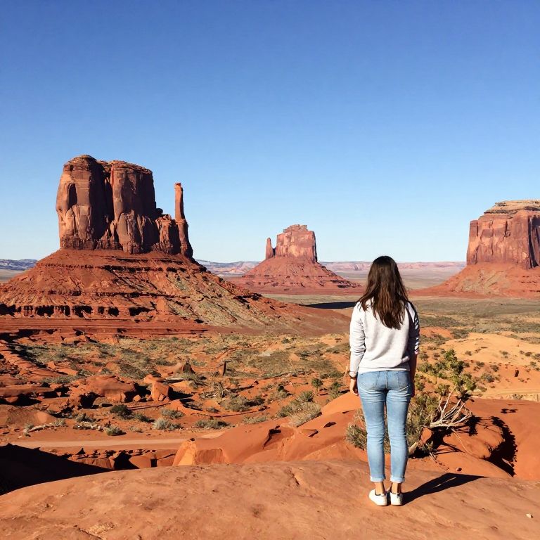Photograph of a woman with long black hair, white hoodie, and blue jeans, standing on red desert rock, facing iconic Arizona desert landscape with large