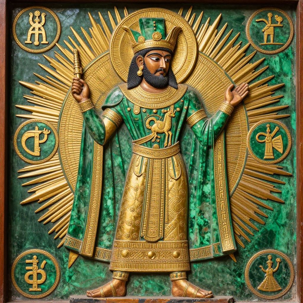 A detailed relief sculpture of Ormazd (Ahura Mazda), the supreme god in Zoroastrianism, depicted wearing richly adorned green and gold robes with intricate patterns. The figure is surrounded by golden rays and with traditional symbols within circular frames on a dark green background. The artwork reflects ancient Persian religious art and symbolism.