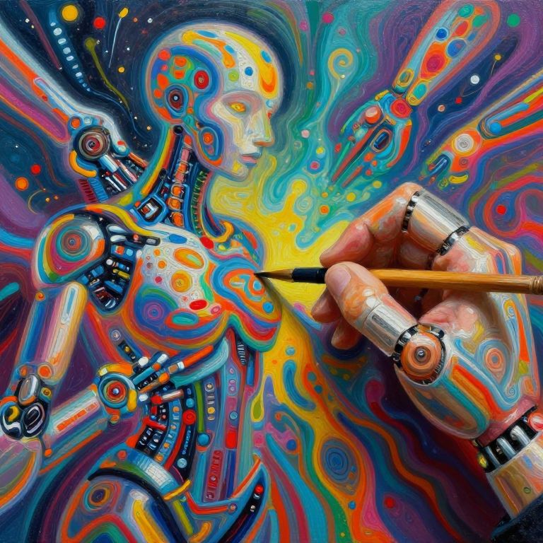 Vibrant digital painting of a robotic figure with colorful abstract patterns, being painted by human hands holding a brush.