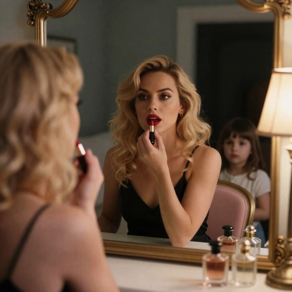 Photograph of a woman with blonde, curly hair applying red lipstick in front of a mirror. A child with brown hair and bangs sits in a pink chair behind her. Dimly lit room with two table lamps, ornate mirror, and various glass perfume bottles on a dresser. Woman's intense expression, child's neutral expression.