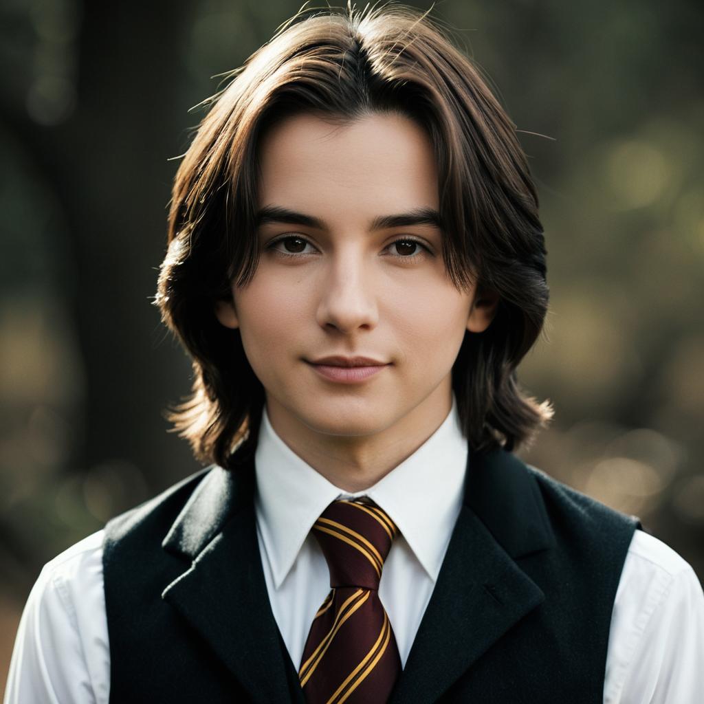 Harry potter costume guy,hogwarts school uniform, 1boy, male focus, necktie, solo, realistic, glasses, brown hair, blurry background, green necktie, blurry, shirt, school uniform, collared shirt, round eyewear, white shirt, closed mouth, coat, vest, outdoors