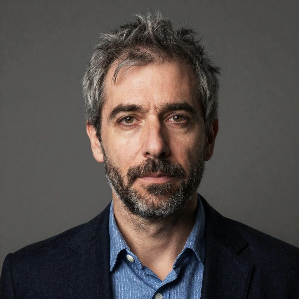 Photograph of a middle-aged man with short gray hair and a beard, standing in profile on a weathered dock. He wears a black shirt, smiling. Industrial structures and a ship in the background. Bright sunlight. Blue sky. Foreground has dock railings. Man on the right, background on the left.