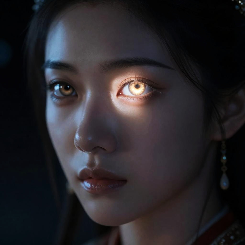Close-up photograph of a young woman with glowing, reflective eyes in a dark, blue-lit environment, highlighting her smooth skin and subtle, natural makeup