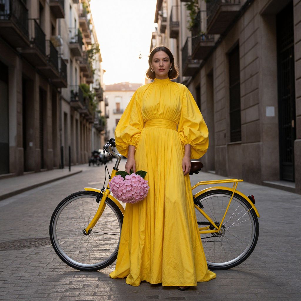In the heart of Barcelona, a woman stands confidently in a narrow alleyway, her presence illuminated by the warm glow of the setting sun. She is adorned in a striking yellow Balenciaga dress from the 2023 collection, its vibrant hue contrasting beautifully with the muted tones of the surrounding architecture. The dress, with its high neckline and voluminous sleeves, flows elegantly around her, accentuating her poised stance. In her hand, she holds a bouquet of pink hydrangeas, their soft petals adding a touch of delicacy to the scene. To her side, a classic bicycle, its frame painted in a matching shade of yellow, rests against the wall, its presence both practical and stylish. The cobblestone street, lined with tall buildings and balconies, frames the woman and her bicycle, creating a sense of depth and perspective. The overall composition, with its interplay of colors, textures, and shapes, captures a moment of timeless elegance and urban sophistication.
