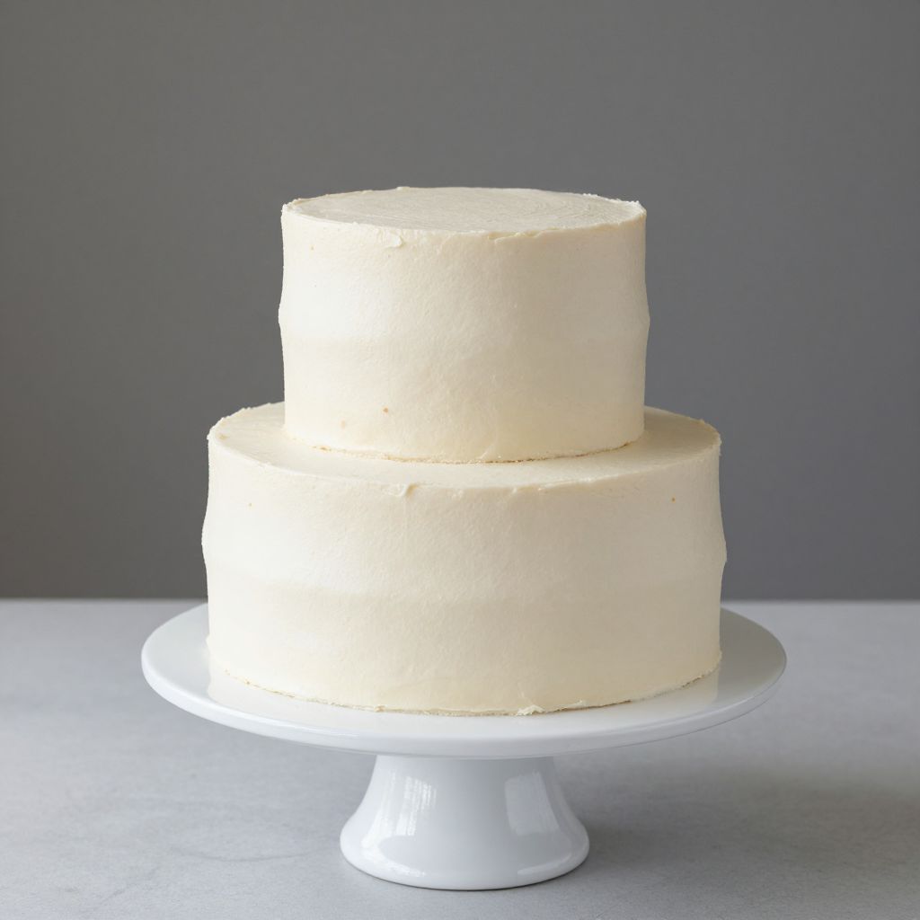 Two-tiered vanilla cake with minimal white frosting elegantly presented on a sleek white cake stand, showcasing its simple yet sophisticated design.