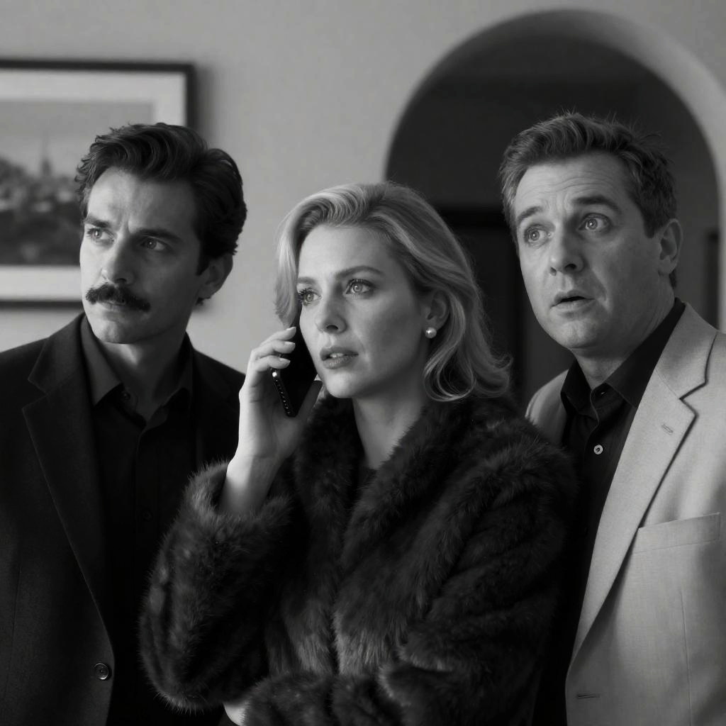 Black and white photograph of three people standing together. A woman with short, wavy hair and a coat on the left, a woman with a bun and a coat in the center, and a man in a suit on the right. All have serious expressions. Background includes a door and staircase.