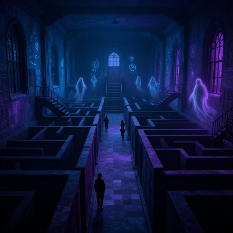 Digital art of a dimly lit, blue and purple-lit, labyrinthine stone hallway with three silhouetted figures, glowing ghostly figures