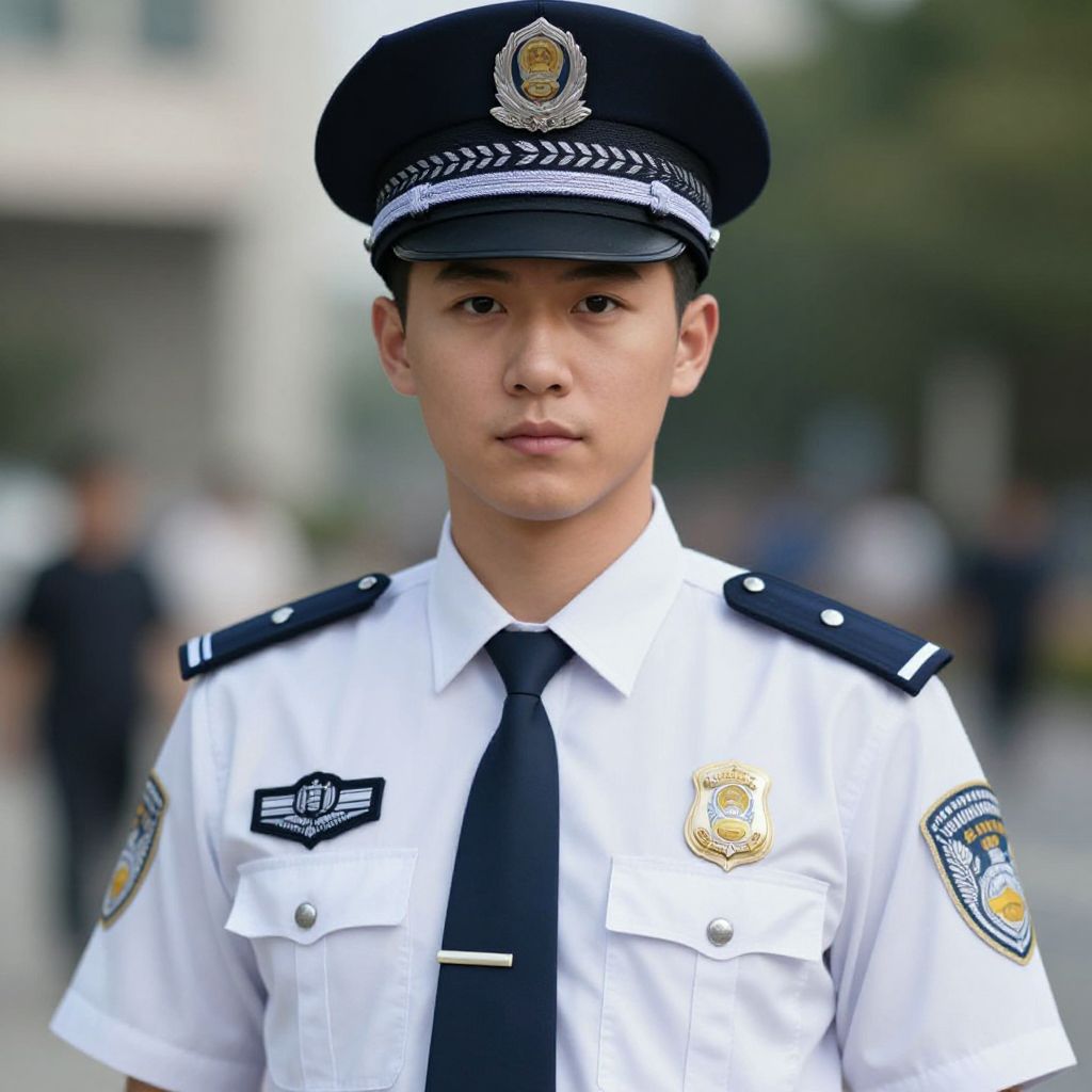 Photograph of a young Asian male in a formal black military uniform with gold epaulettes, black cap, white feather, and serious expression,