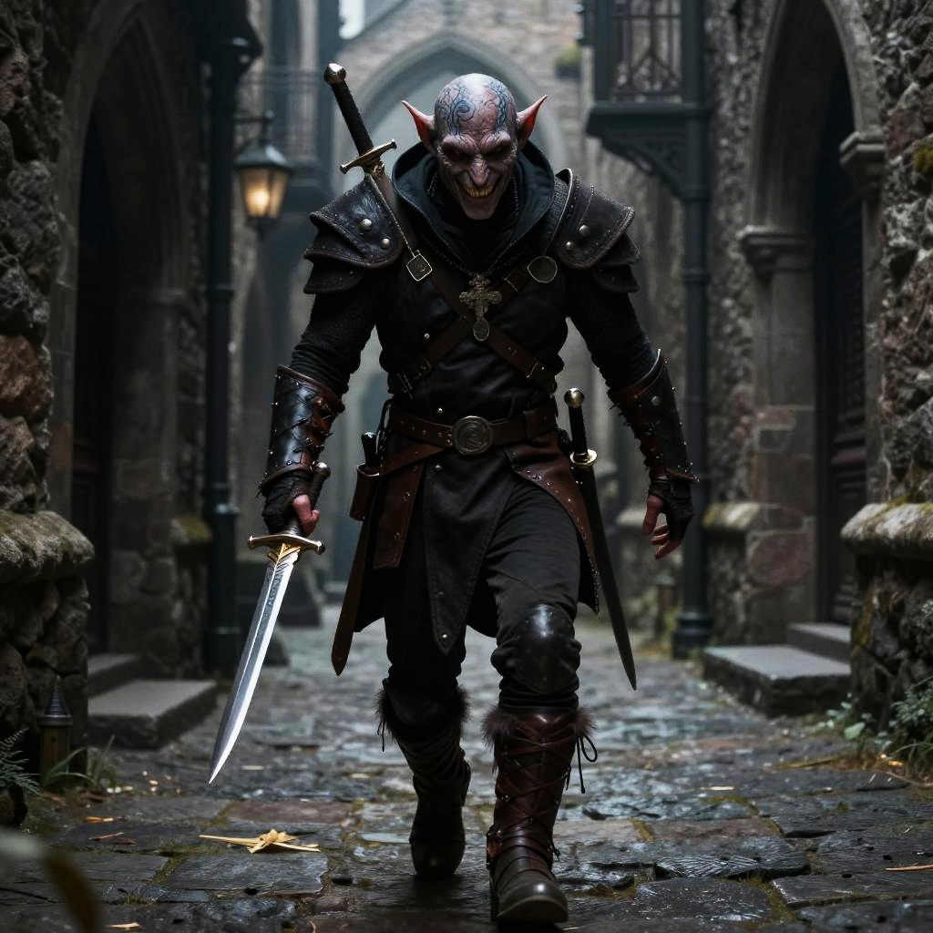 Ratfolk rogue stealthily navigating shadowy medieval alleyways, clad in dark leather armor, with glinting daggers, intricate tattoos, and a sly, cunning expression, fantasy style.