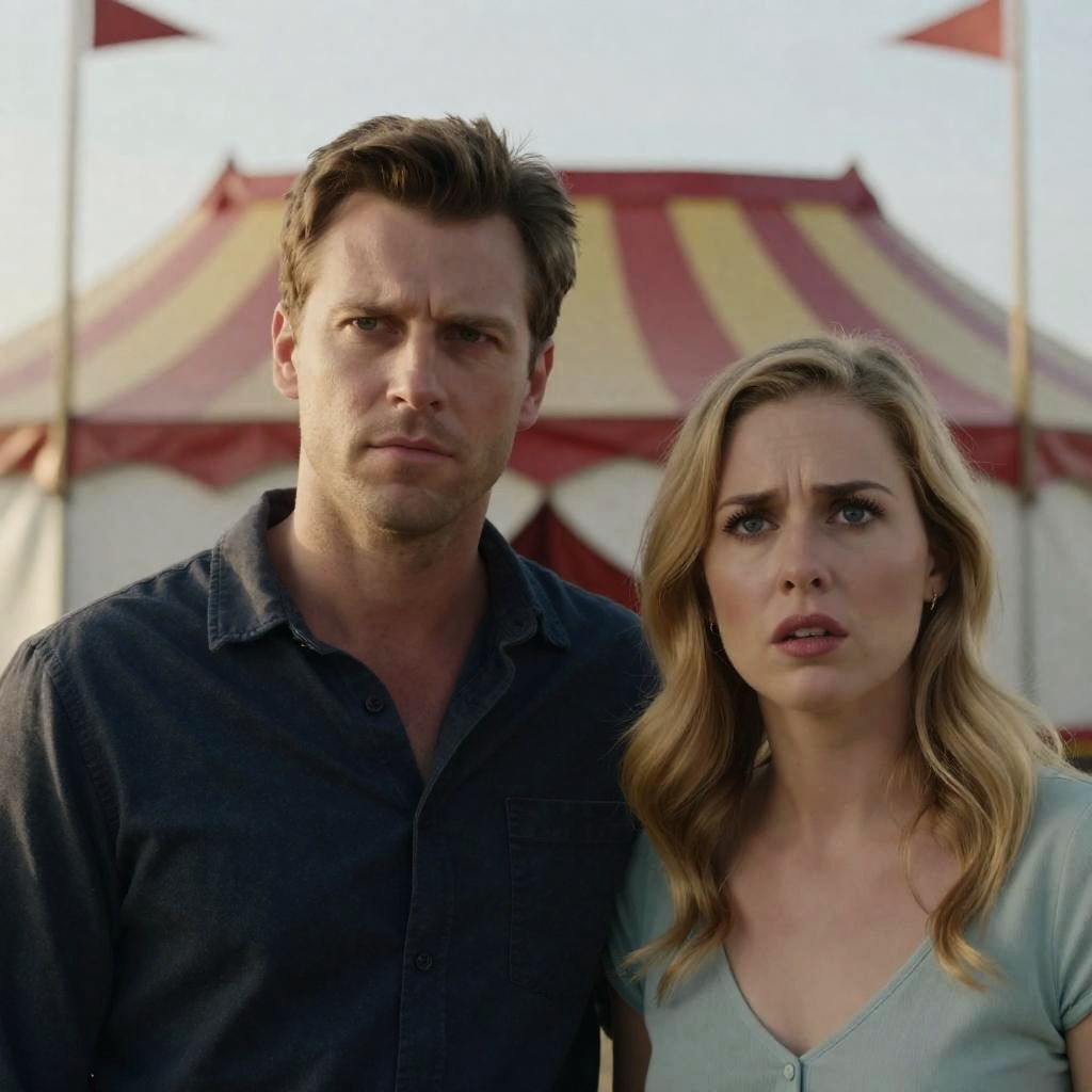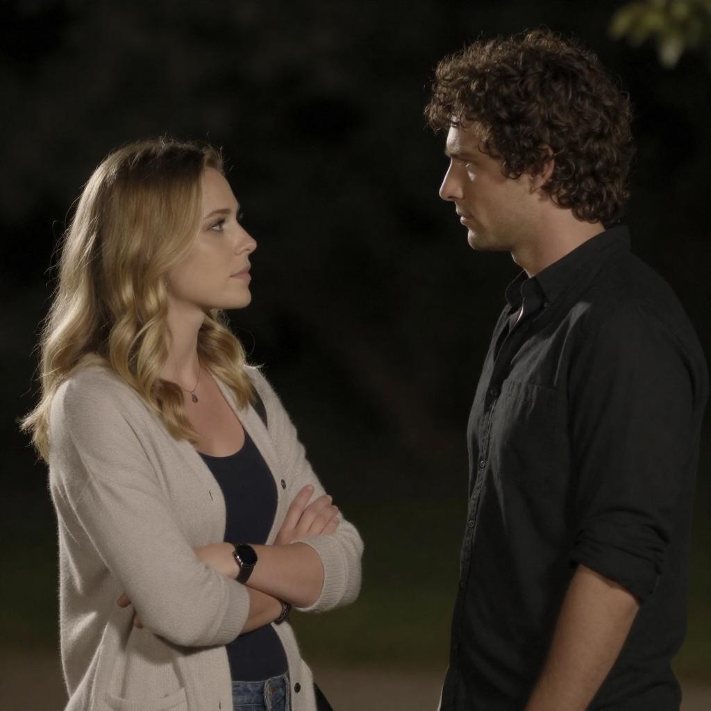 Photograph of two people in a dimly lit, warm-toned cave. A man with long dark hair, wearing a black jacket, stands to the left. A blonde woman with straight hair, in a beige jacket, stands to the right. Both look upward with serious expressions. The background is a rocky cave wall.