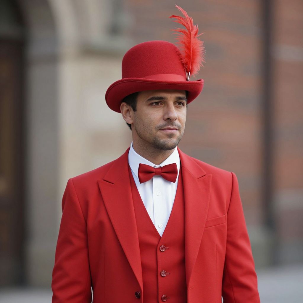 Red Prince Costume, man in a red suit and hat with a red feather